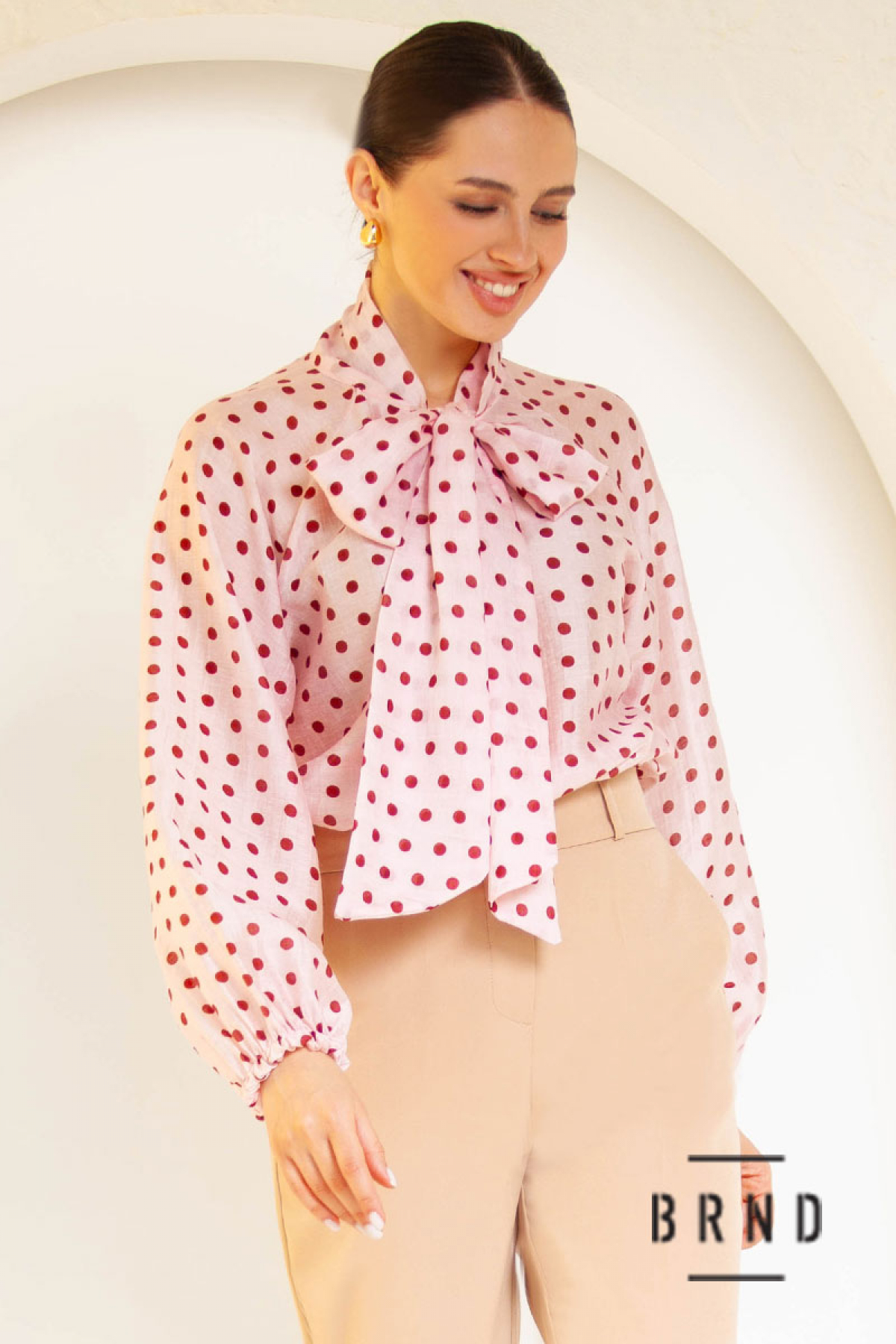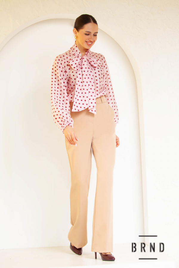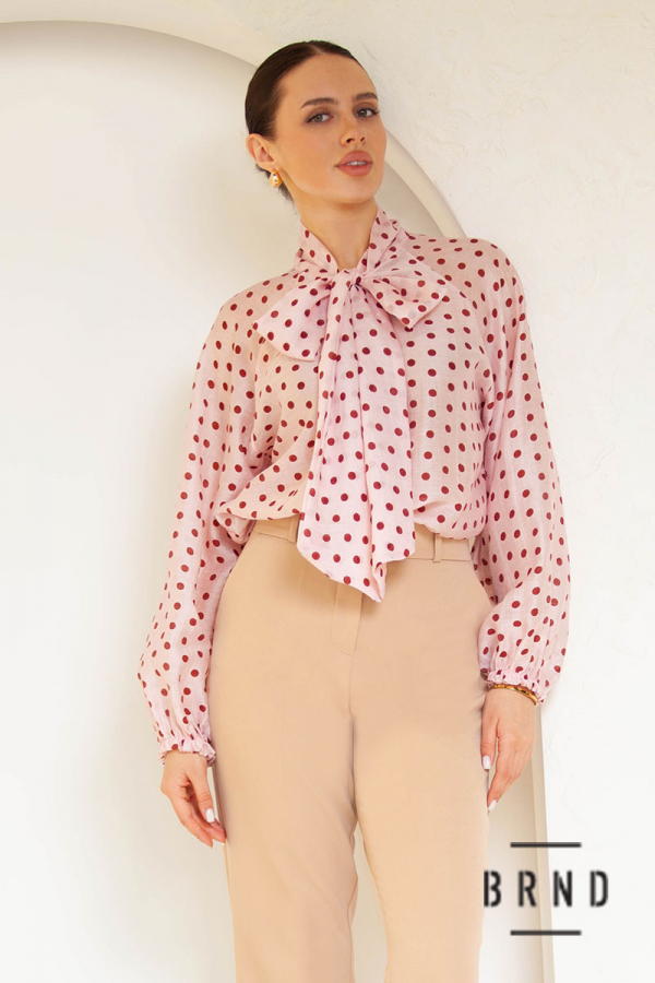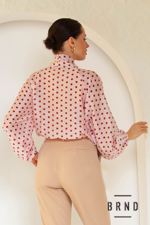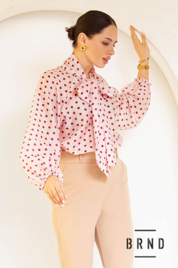 Блуза прямого крою з принтом polka dot та декоративним коміром-бантом, рукав-буф (AniNadin)