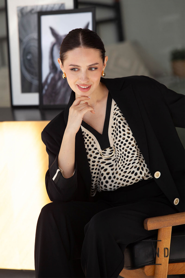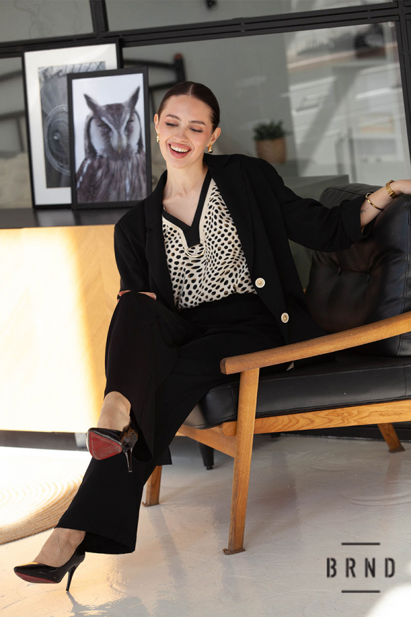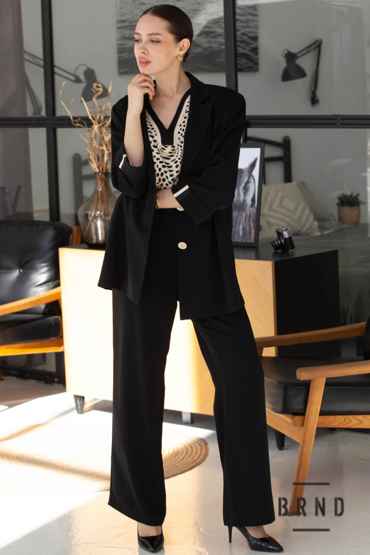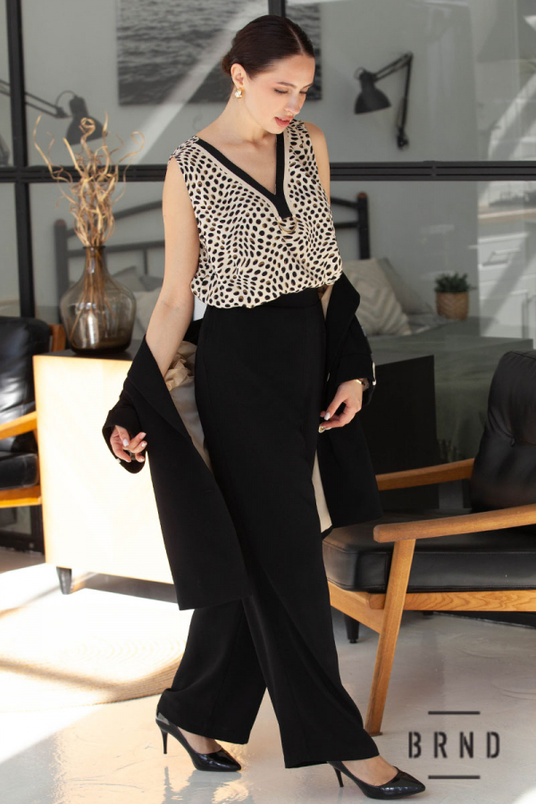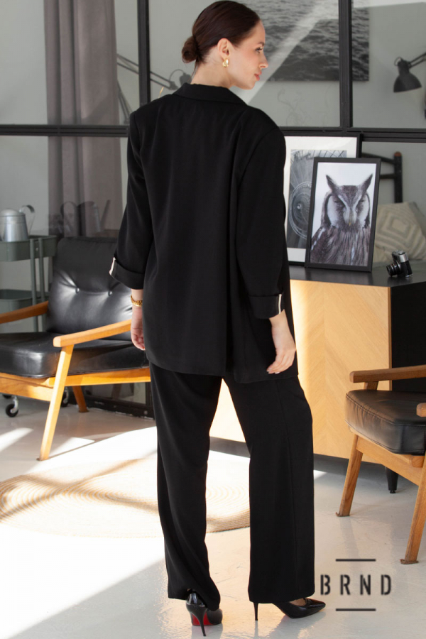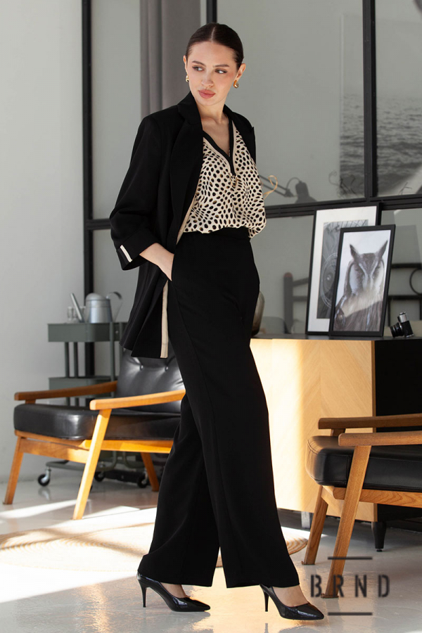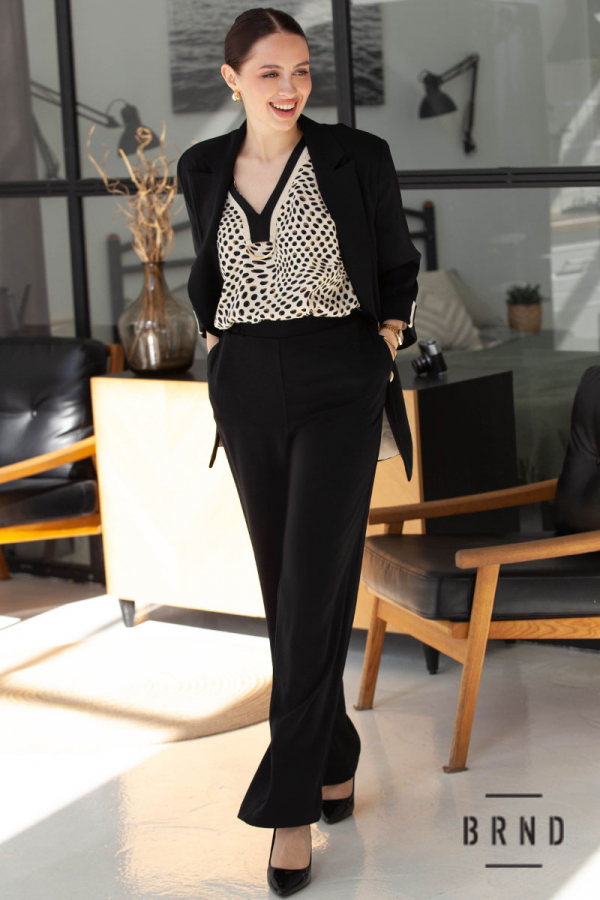 Костюм-трійка: жакет прямого крою; майка прямого крою, V-виріз; штани прямі, широкі, посадка висока, пасок-гумова стрічка (AniNadin)