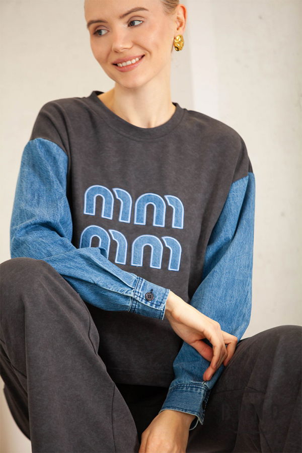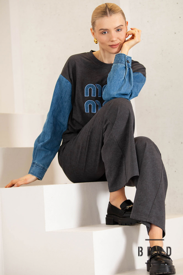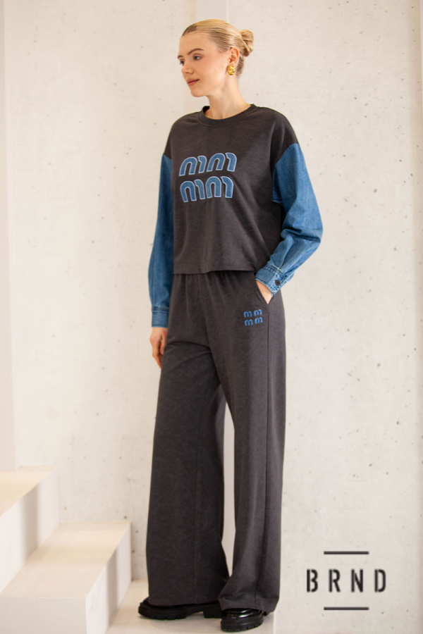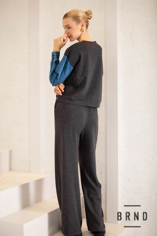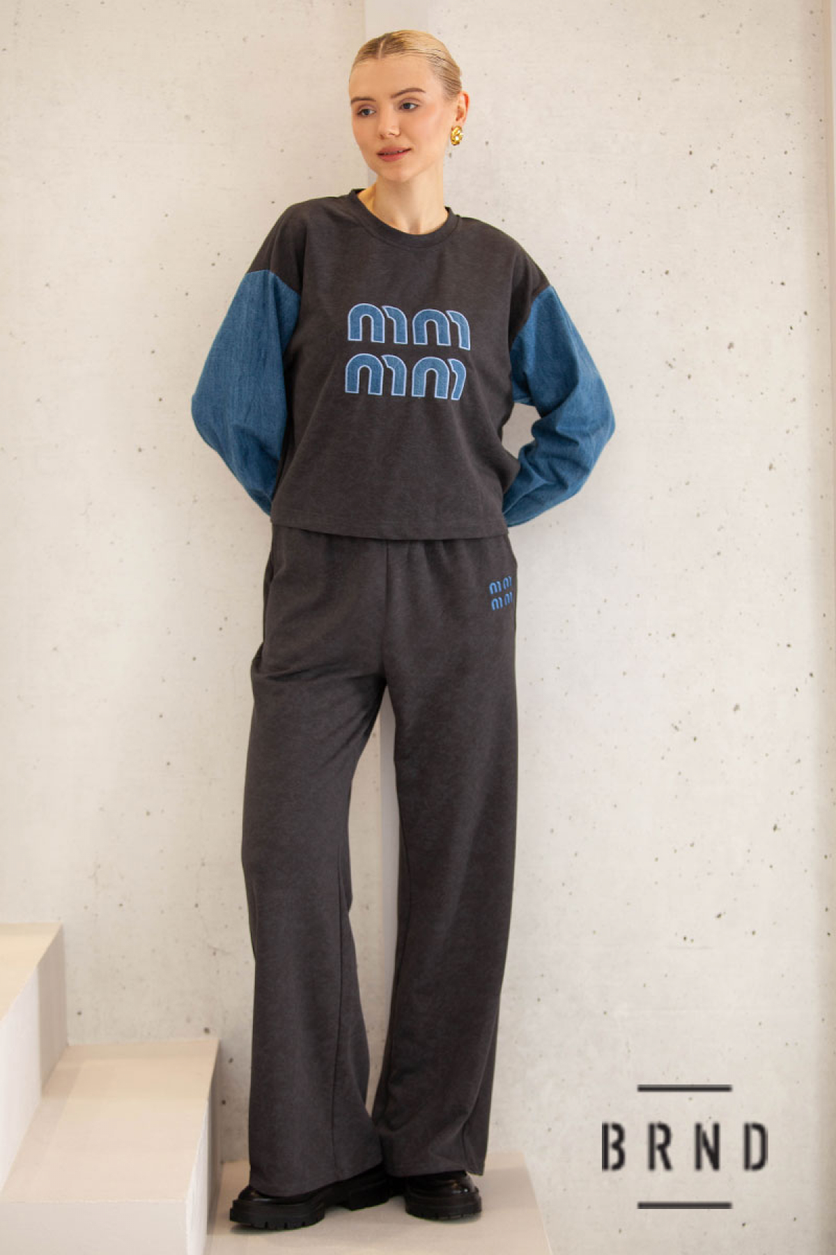 Костюм трикотажний комбінований з денімом: кофта вільного крою, лінія плеча спущена; штани з косими кишенями, прямі, широкі, пасок-гумова стрічка, осадка висока (BRENDA)
