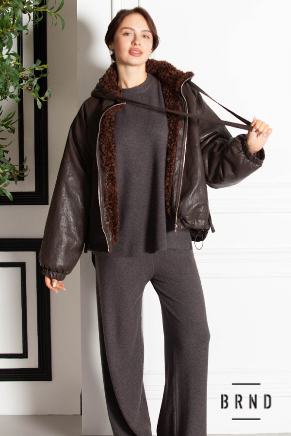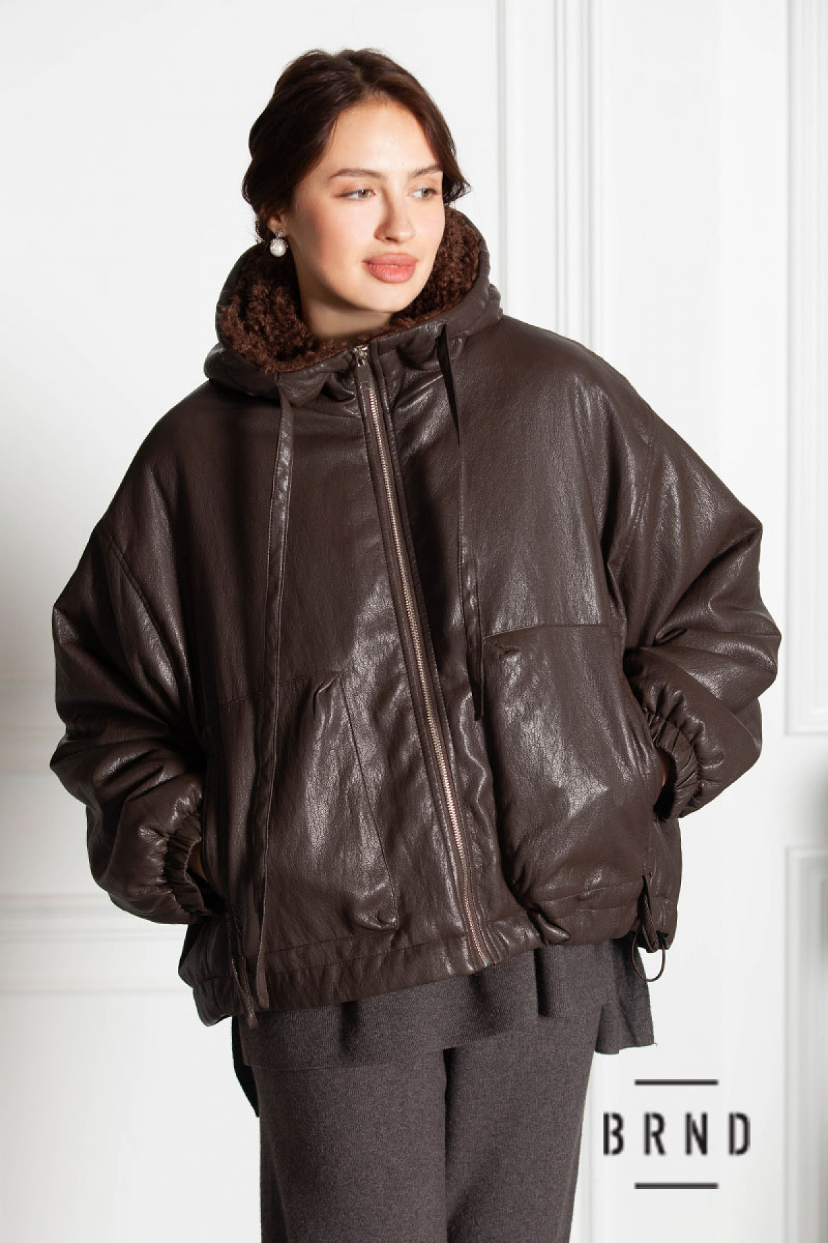 Куртка з екошкіри вільного крою, з каптуром, на блискаці (Chloe)