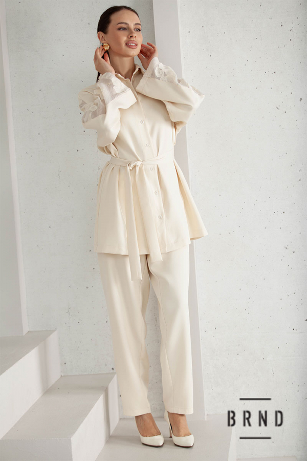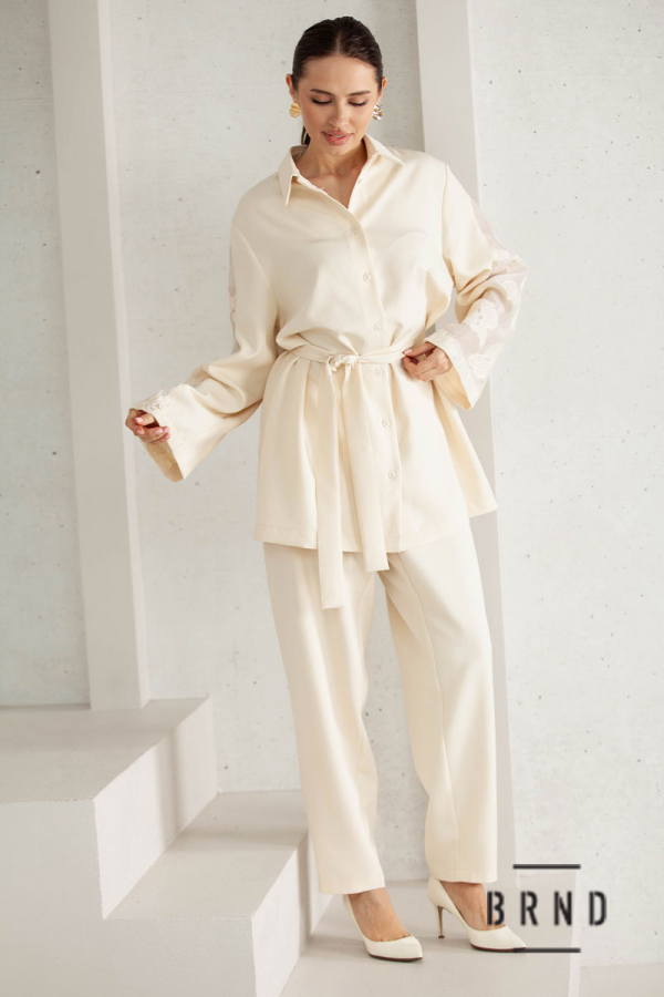 Костюм: сорочка з паском, крій прямий, рукав з гіпюровою вставкою; штани завужені, пасок комбінований з гумовою стрічкою, посадка висока (Chloe)