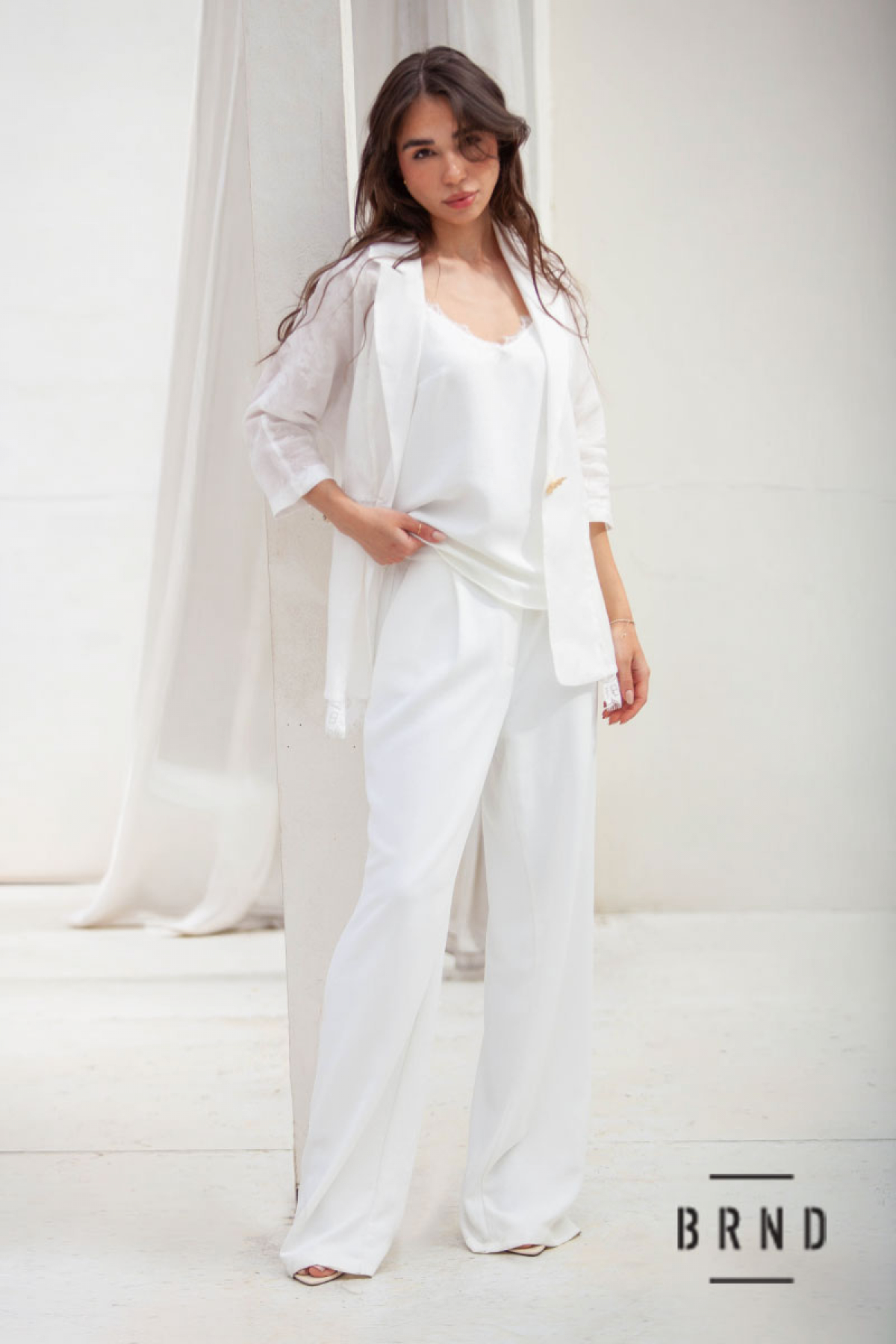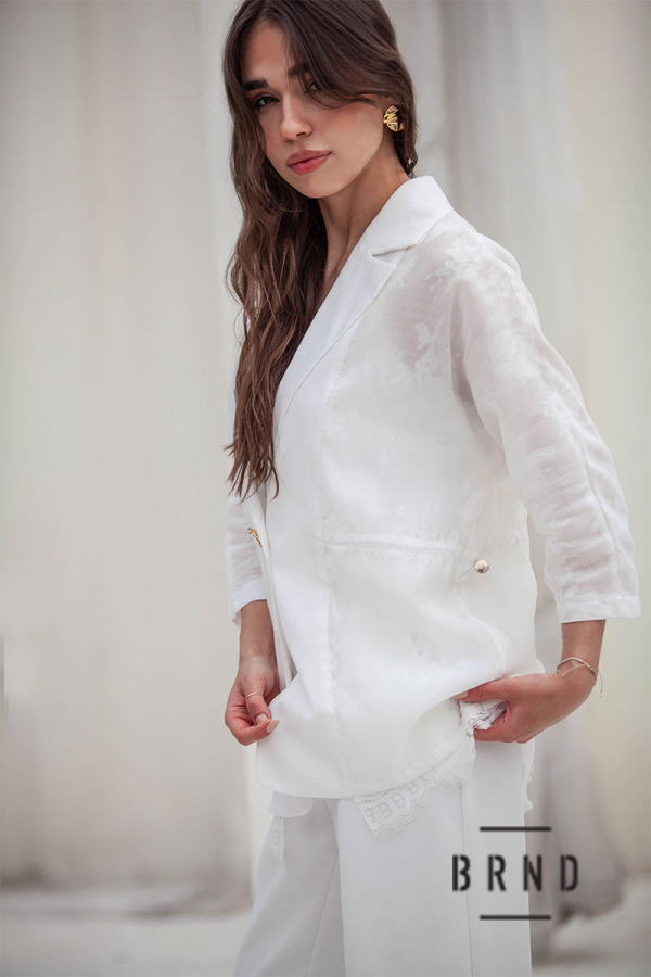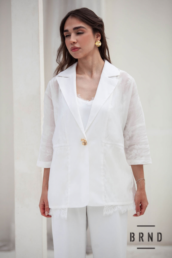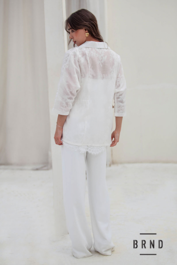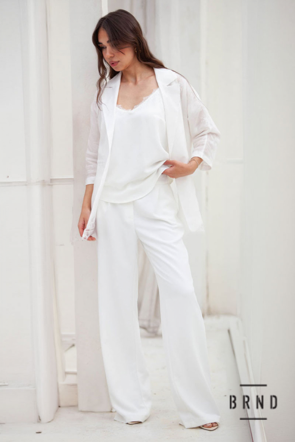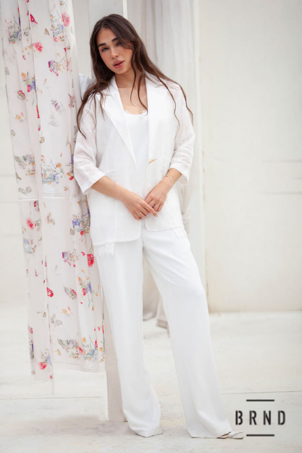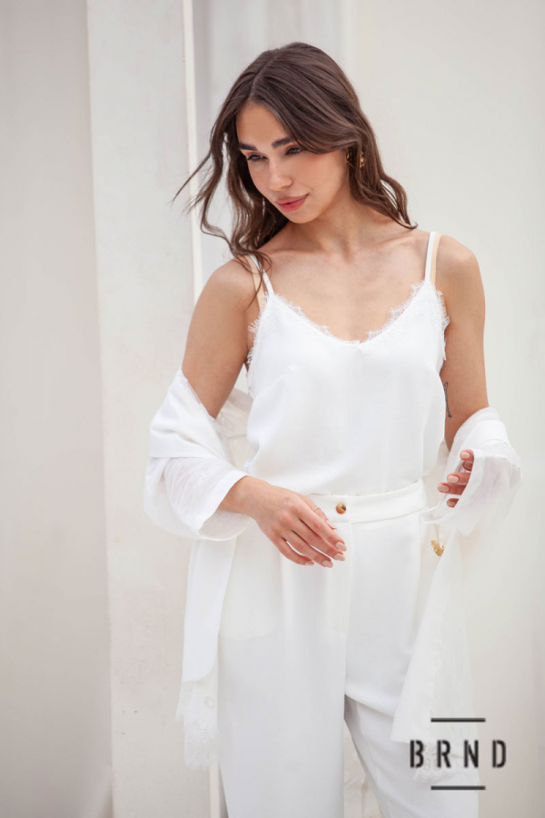 Костюм-трійка: жакет комбінований з мереживом, вільного крою, пасок-вшита регульована гумова стрічка, рукава 3/4; майка прямого крою, оздоблення-мереживо; штани прямі з косими кишенями, посадка висока (Chloe)