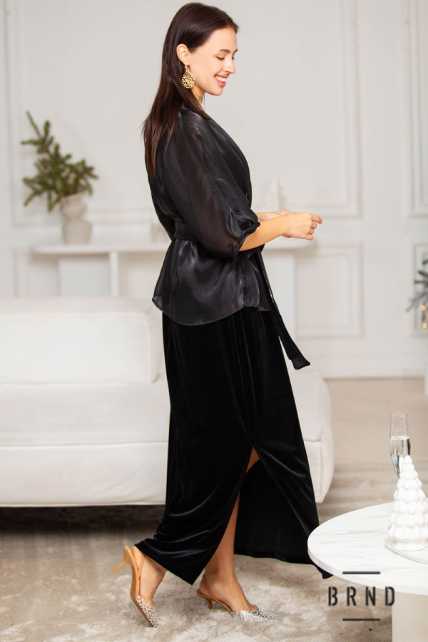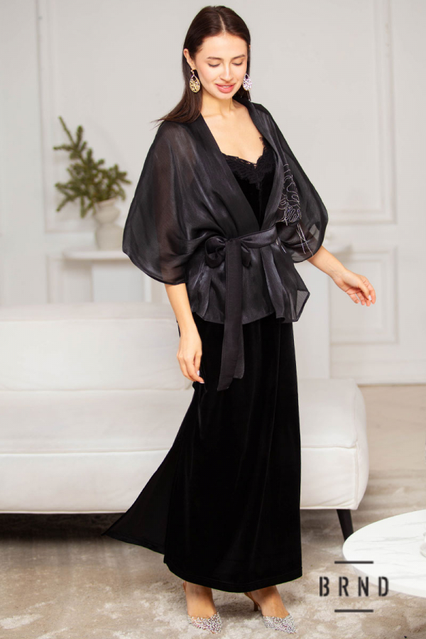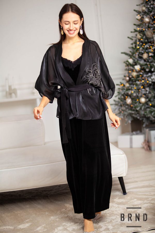 Костюм: жакет прозорий з паском, крій вільний, декор-вишивка дрібними ланцюгами; сукня-комбінація оксамитова, прямого крою, з розрізами, декор-мереживо (Dolce & Gabbana)