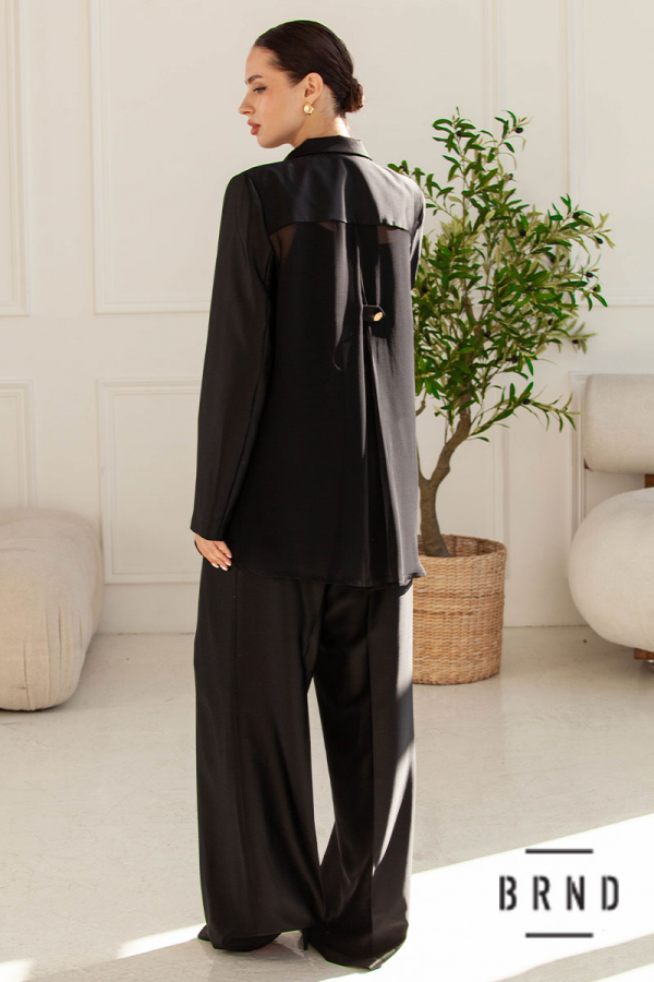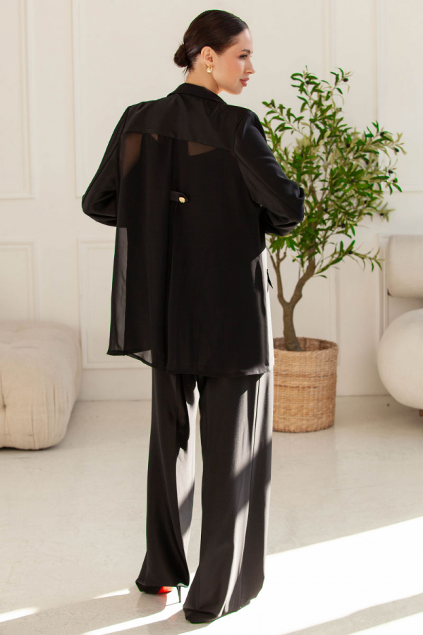 Костюм: жакет вільного крою, з сітчатою вставкою на спині; штани прямі, широкі, посадка висока (Dolce & Gabbana)