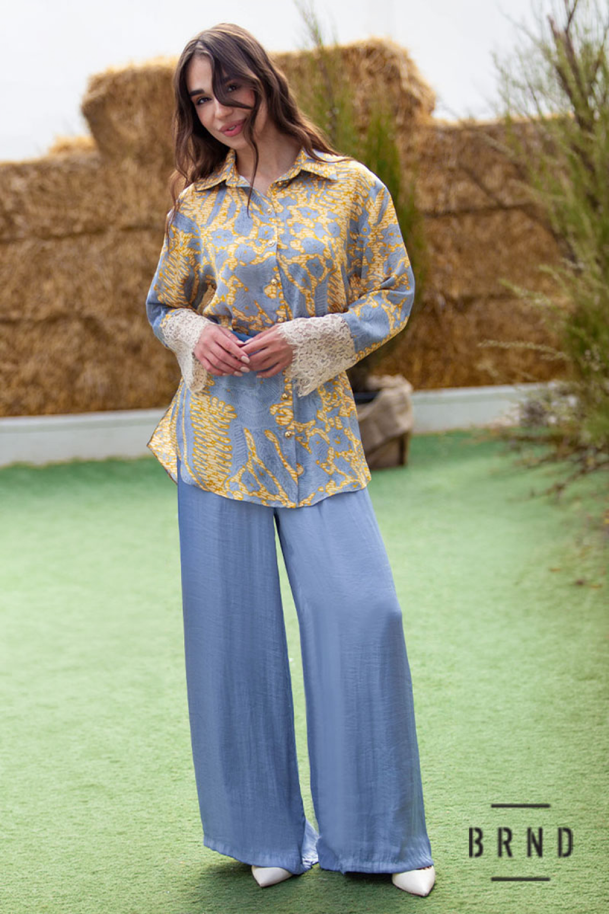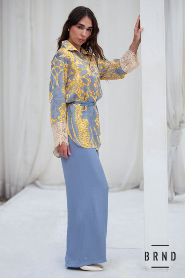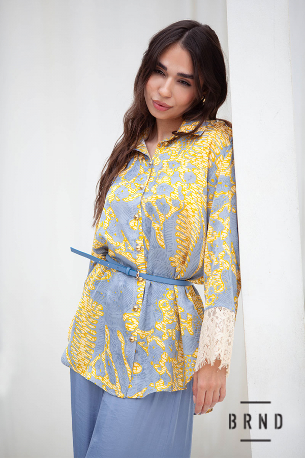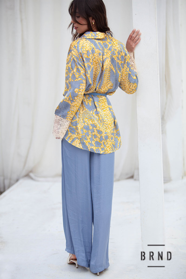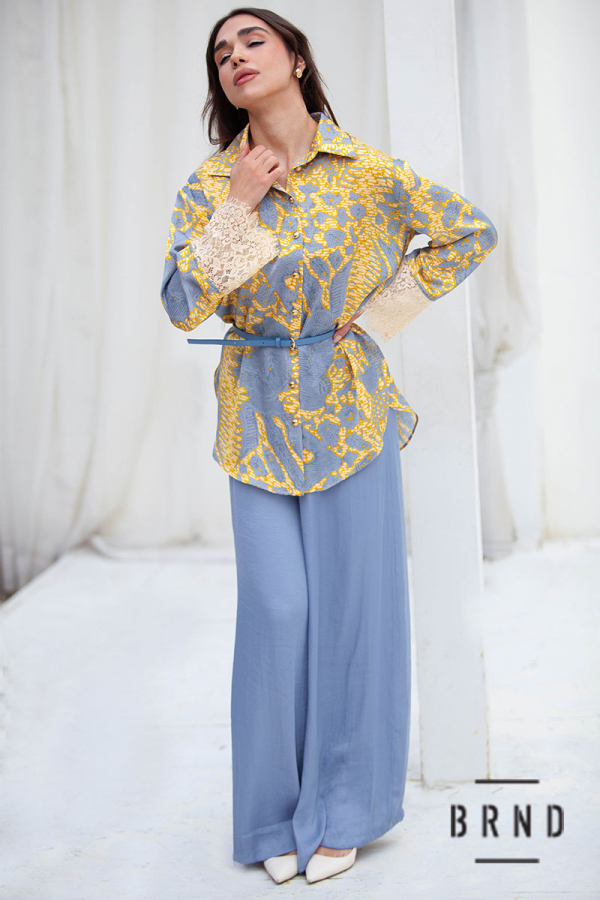 Костюм з паском: сорочка вільного крою, рукава 3/4, оздоблення-мереживо; штани прямі, широкі, пасок-гумова стрічка та шнур (Kenzo)