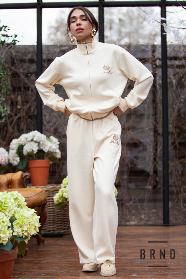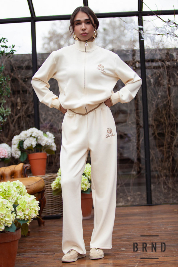 Костюм: кофта прямого крою, з кишенями на блискавці, комір-стійка; штани прямого крою, пасок-гумова стрічка, посадка висока (Loro Piana)