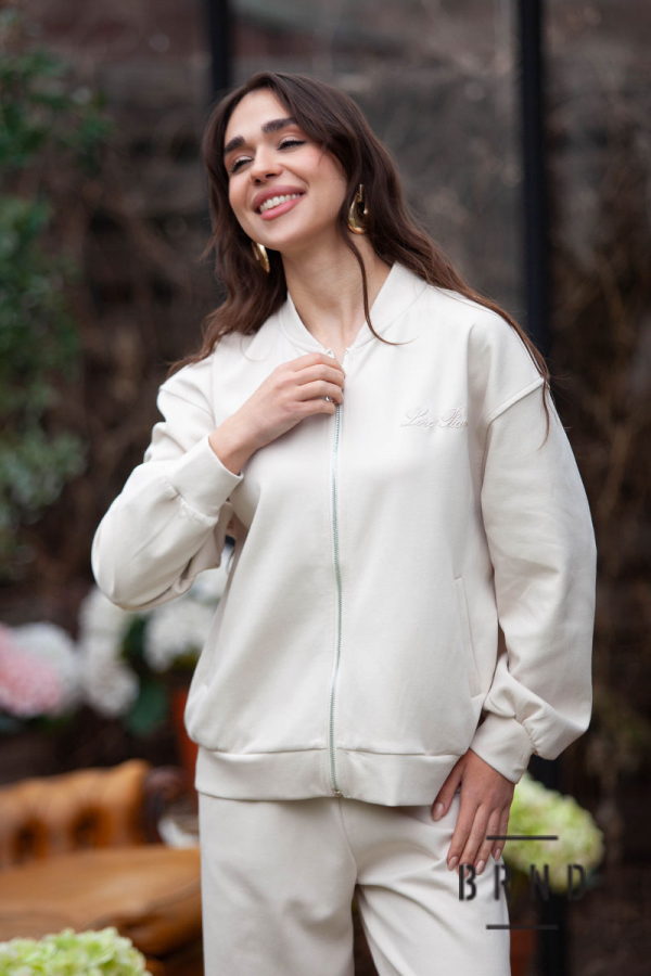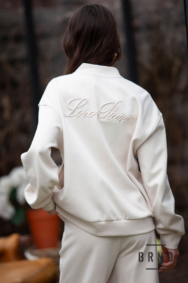 Костюм: бомбер вільного крою; штани прячмі з косими кишенями0 пасок-гумова стрічка, посадка середня (Loro Piana)