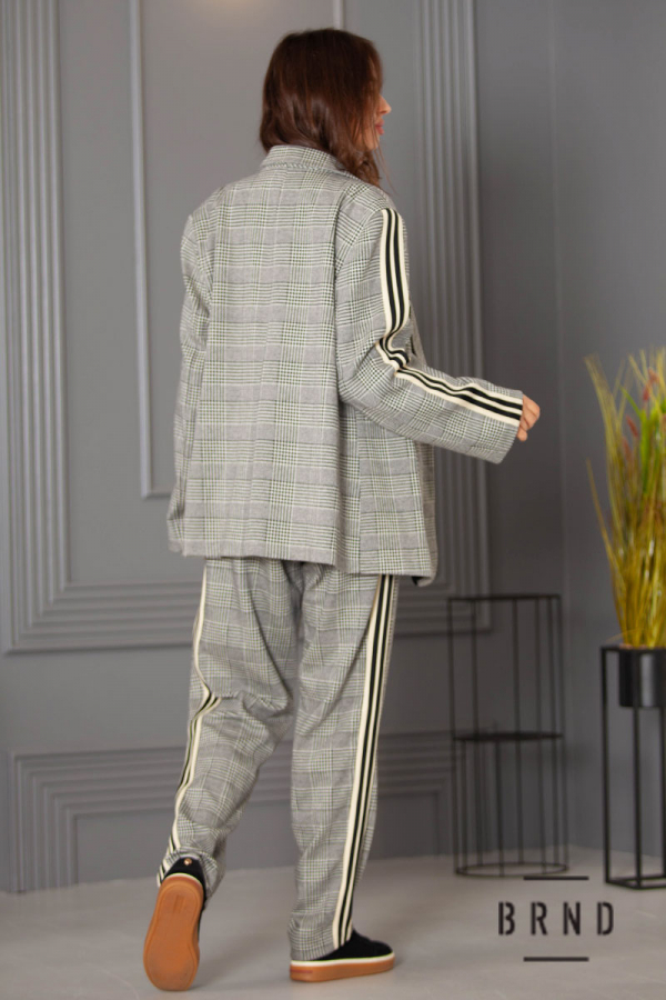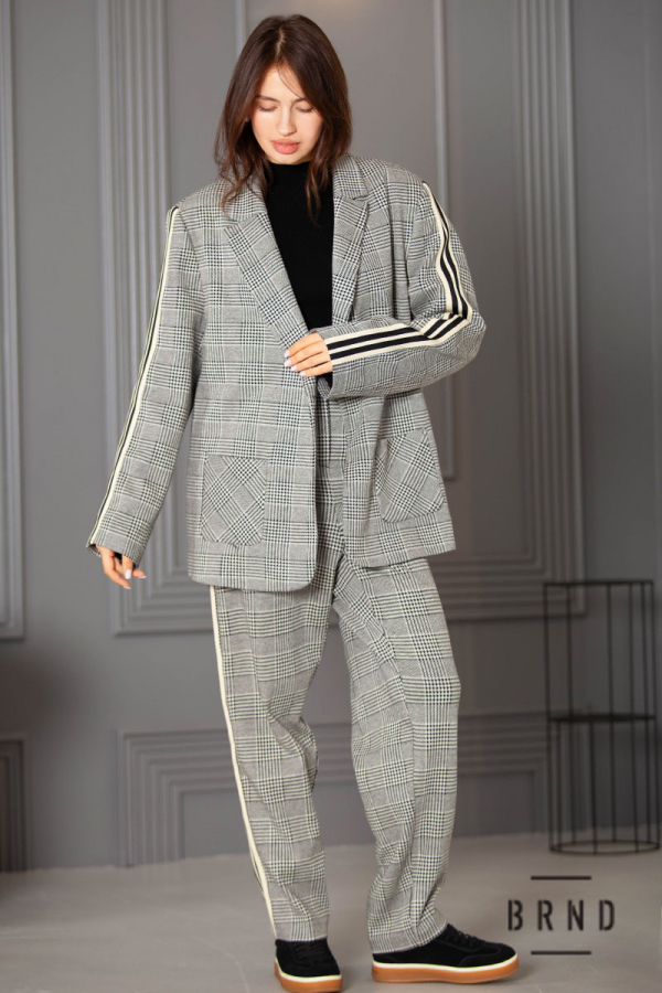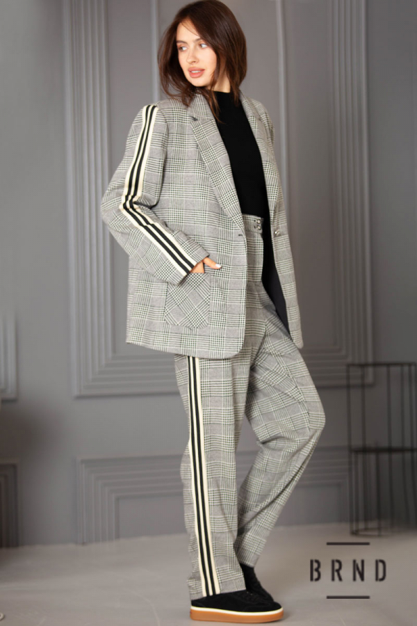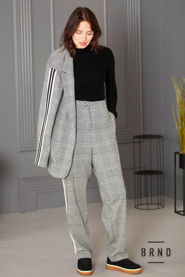 Костюм з лампасами: піджак прямого крою, з накладними кишенями; штани завужені, посадка висока (Max Mara)