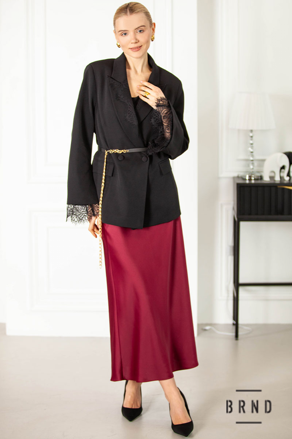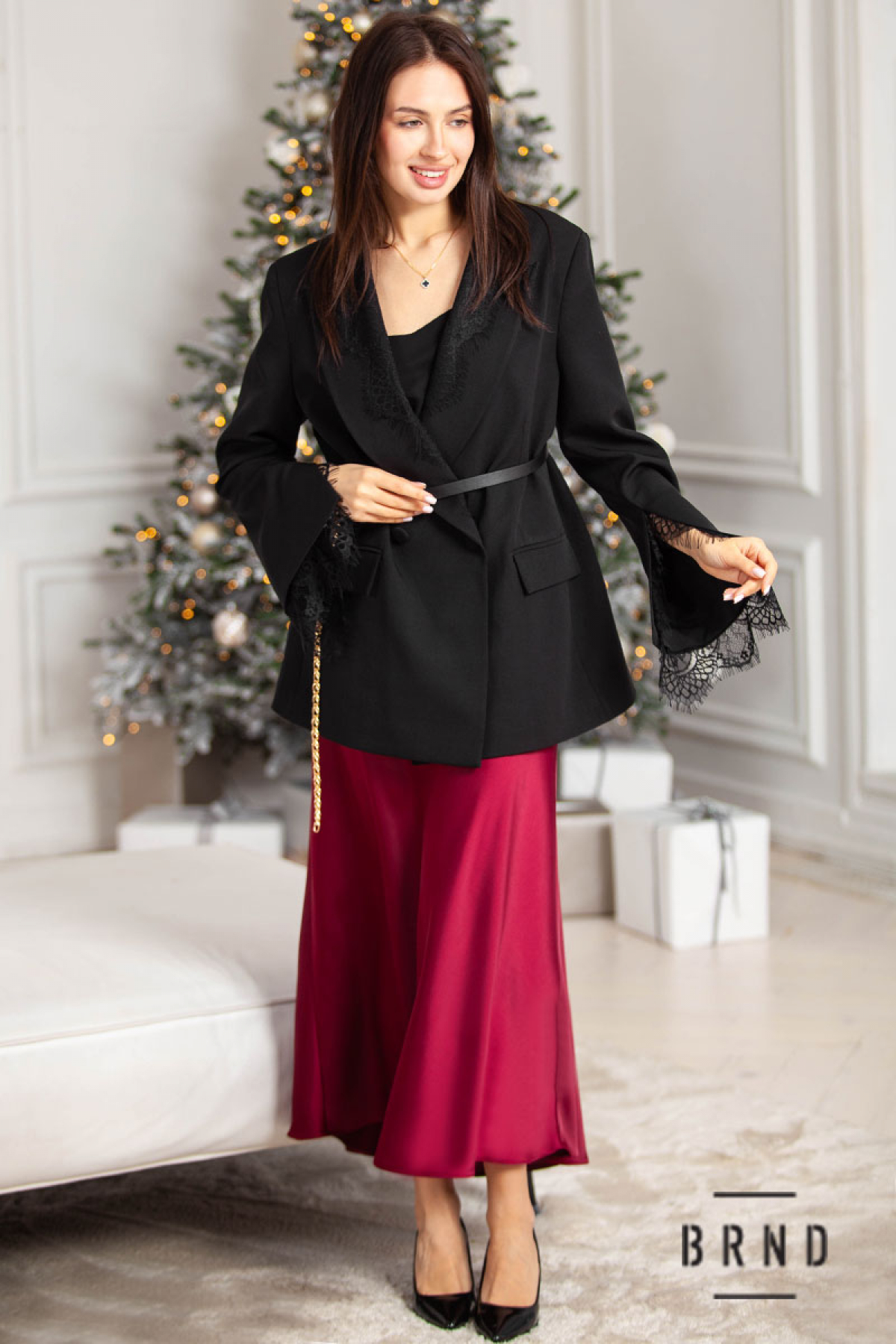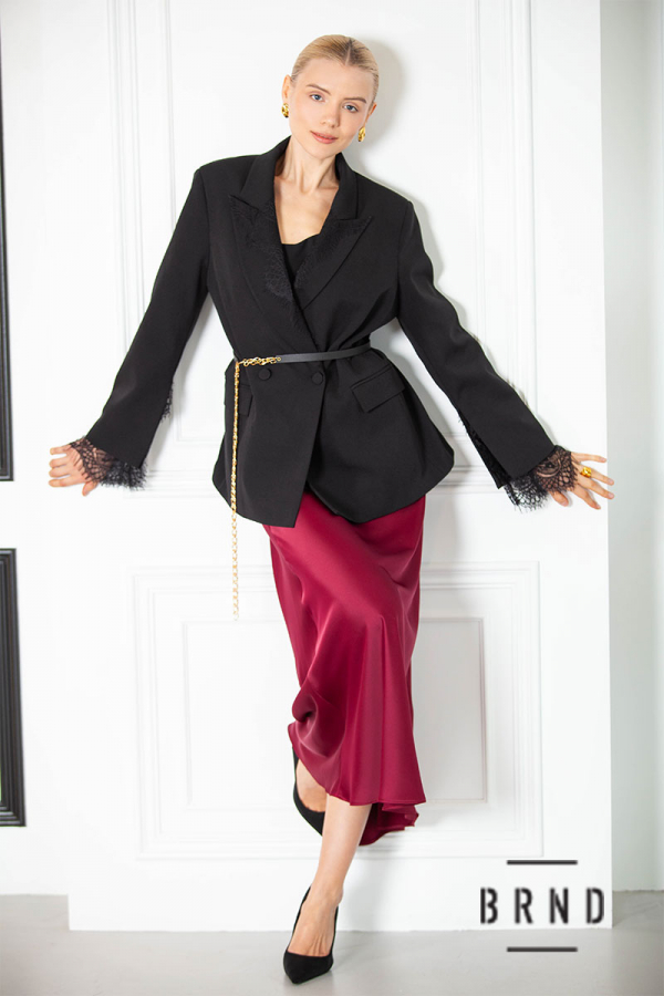 Костюм-трійка: піджак з тонким паском, каркасною лінією плеча та розрізами на рукавах, оздоблення-мереживо, крій прямий (Christian Dior); майка прямого крою (Dolce & Gabbana); спідниця А-подібного крою (Givenchy)