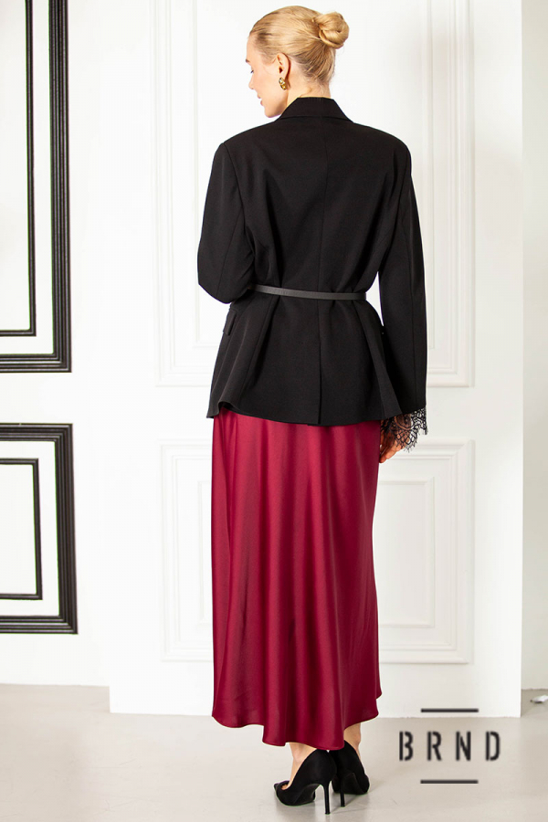 Склад: піджак-віскоза 70%, бавовна 30%; майка-віскоза 100%; спідниця-шовк 65%, віскоза 35%