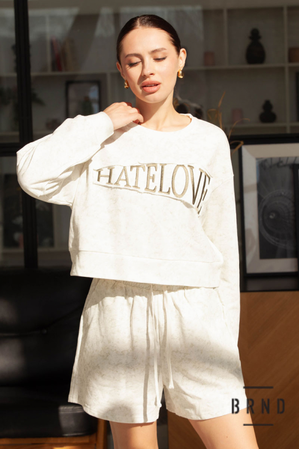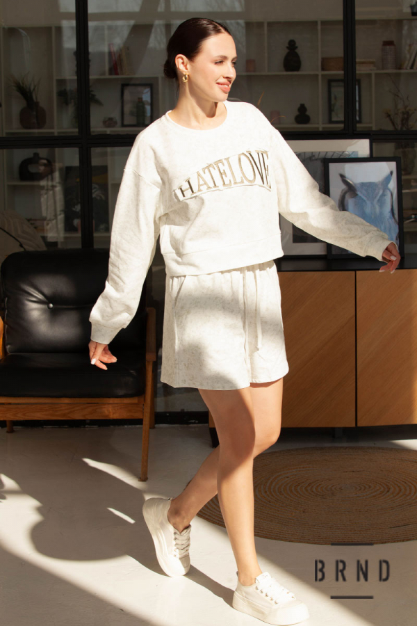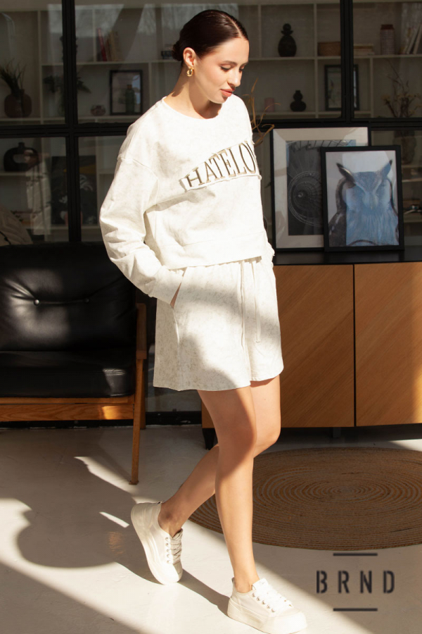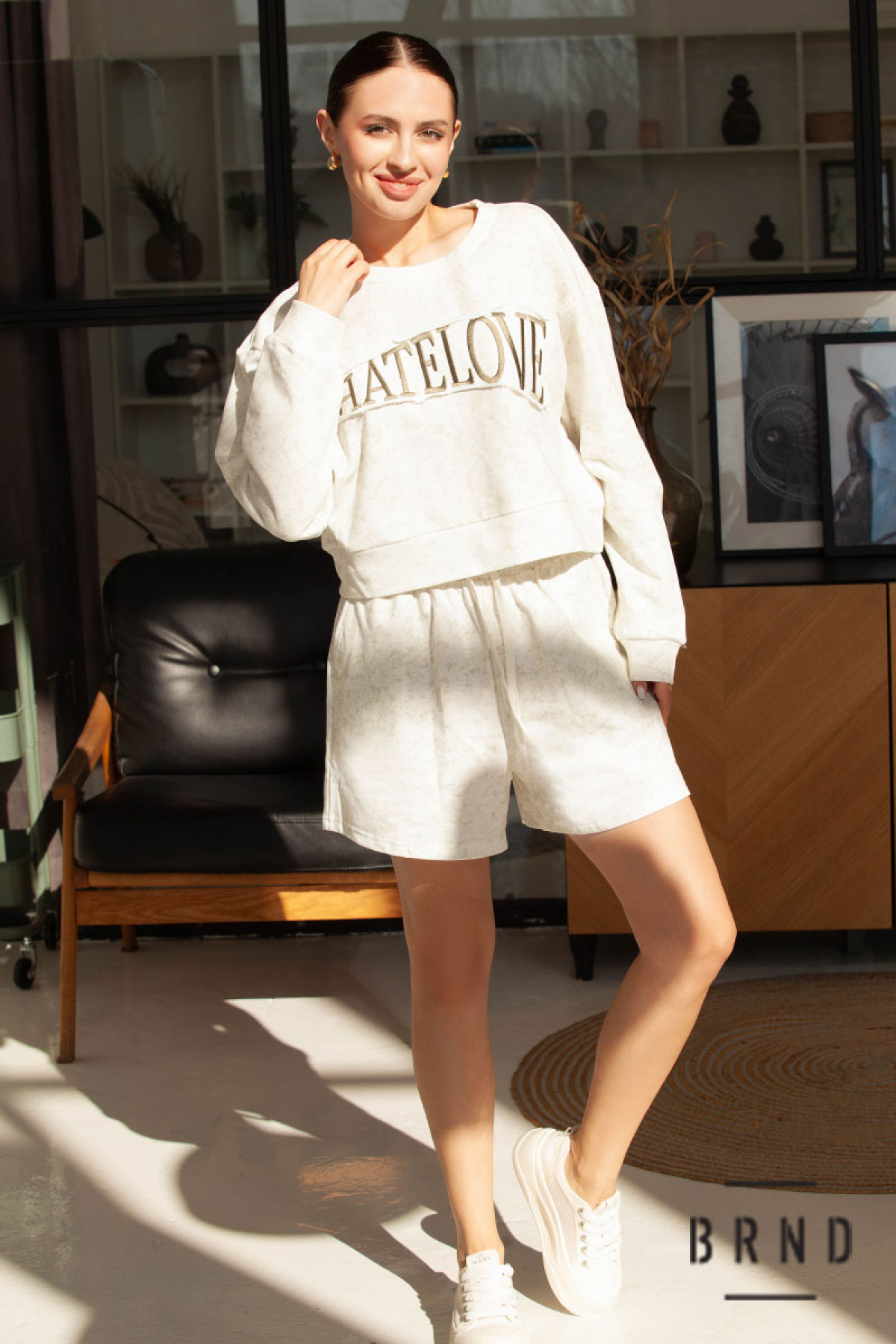 Костюм трикотажный: свитшот свободного кроя с аппликацией; шорты, пояс- резинка (AniNadin)