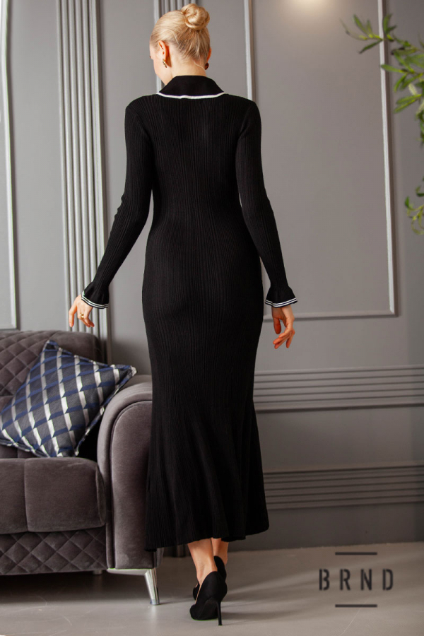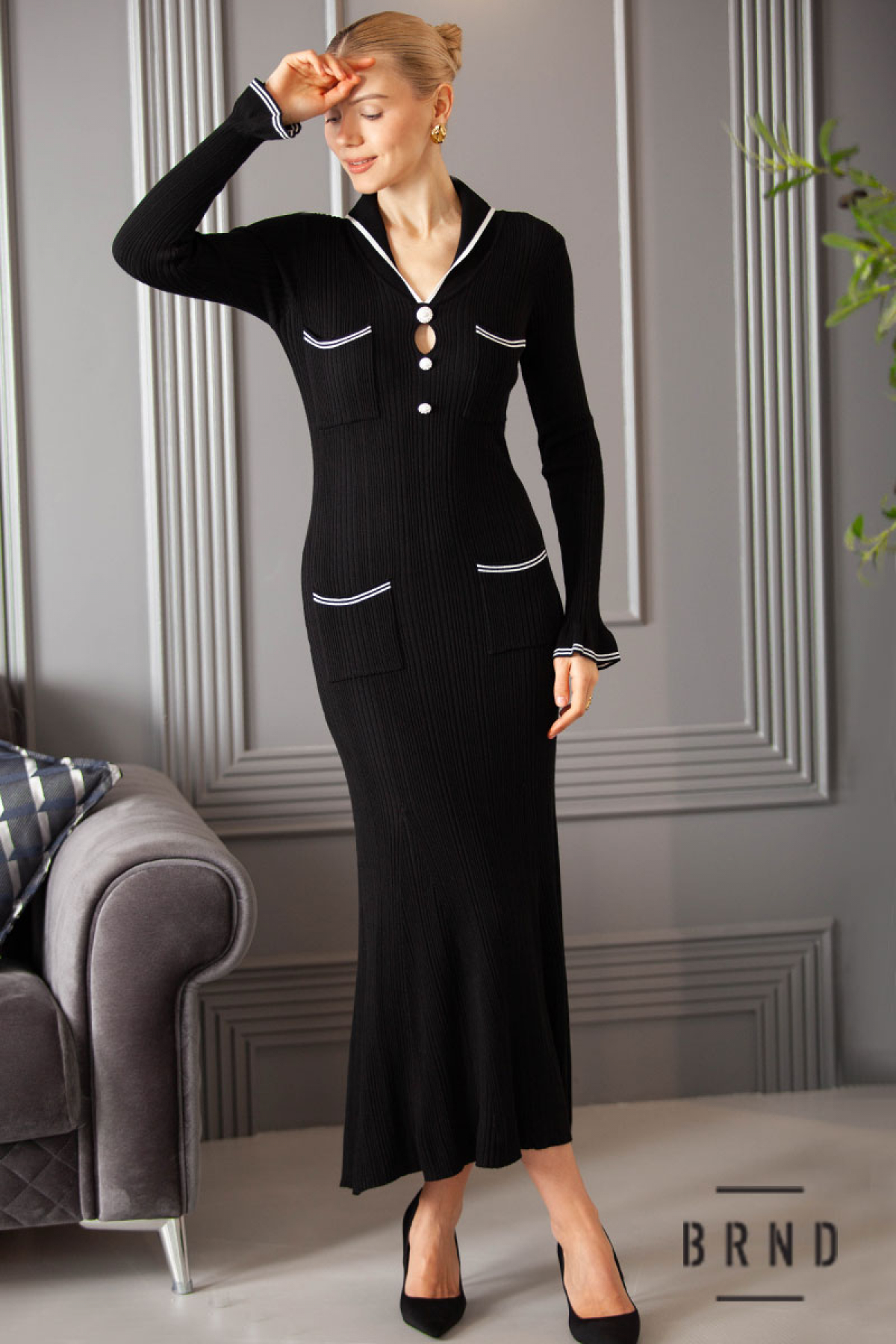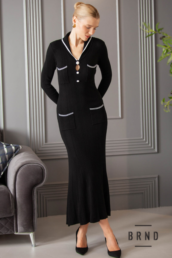 Платье трикотажное приталенного кроя с шалевым воротником и накладными карманами, декор-пуговицы (BRENDA)