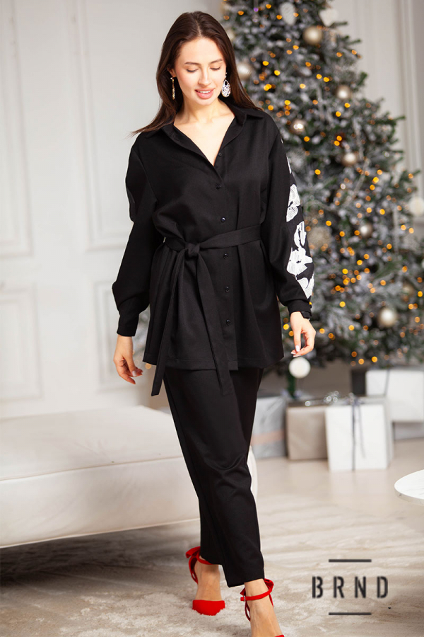 Костюм: рубашка с поясом, крой прямой, рукав с гипюровой вставкой; брюки зауженные, пояс комбинированный с резинкой, посадка высокая (Chloe)