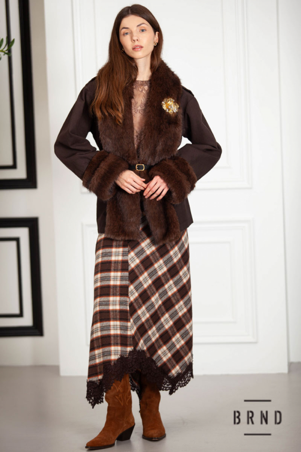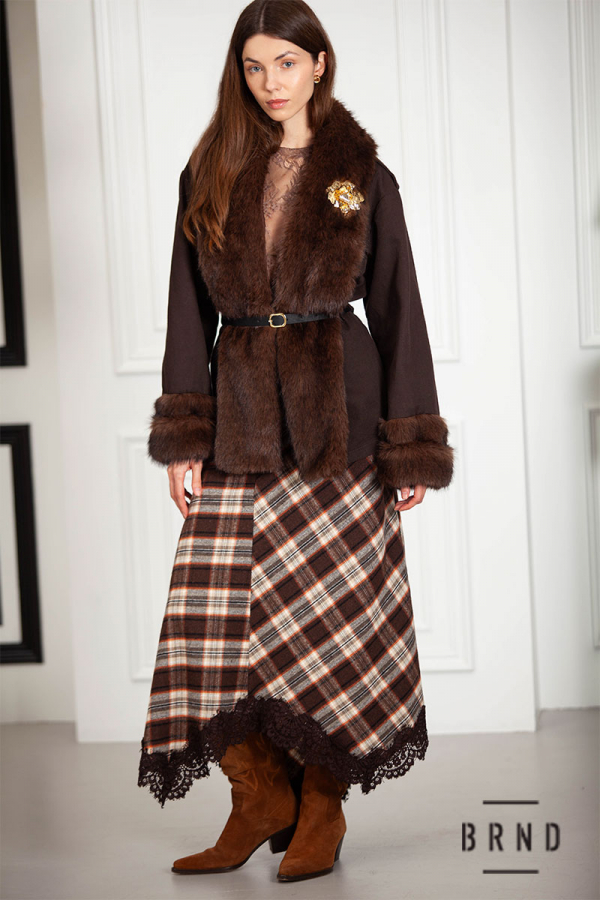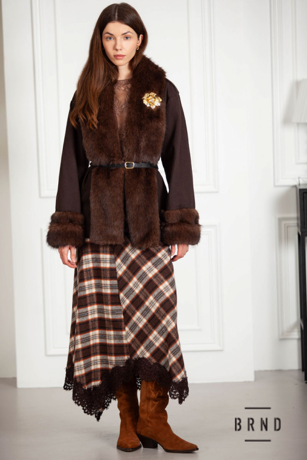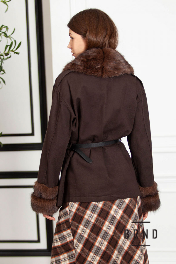 Жакет прямого кроя, с поясом, накладными карманами, брошью и меховыми вставками (Fendi)