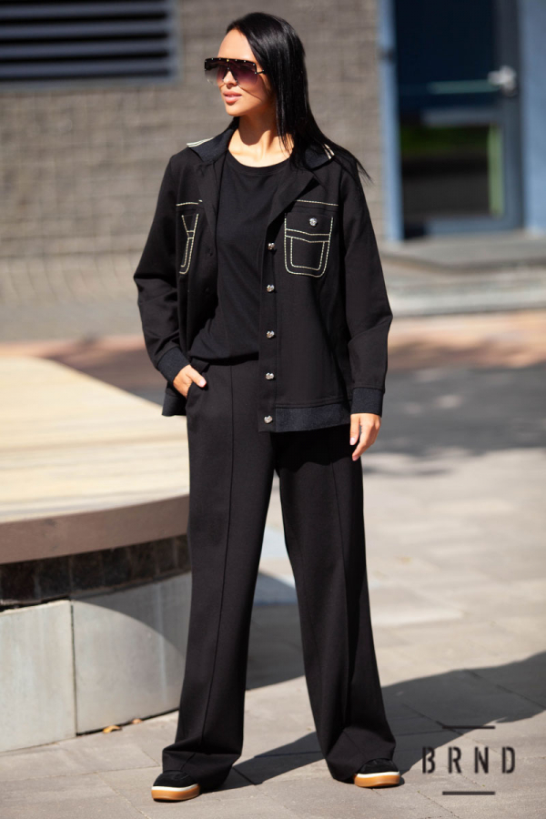 Костюм-тройка трикотажный: жакет прямого кроя, на пуговицах, с трикотажными воротом, манжетами и кантом; футболка прямого кроя; брюки прямые, с косыми карманами, посадка высокая (Givenchy)
