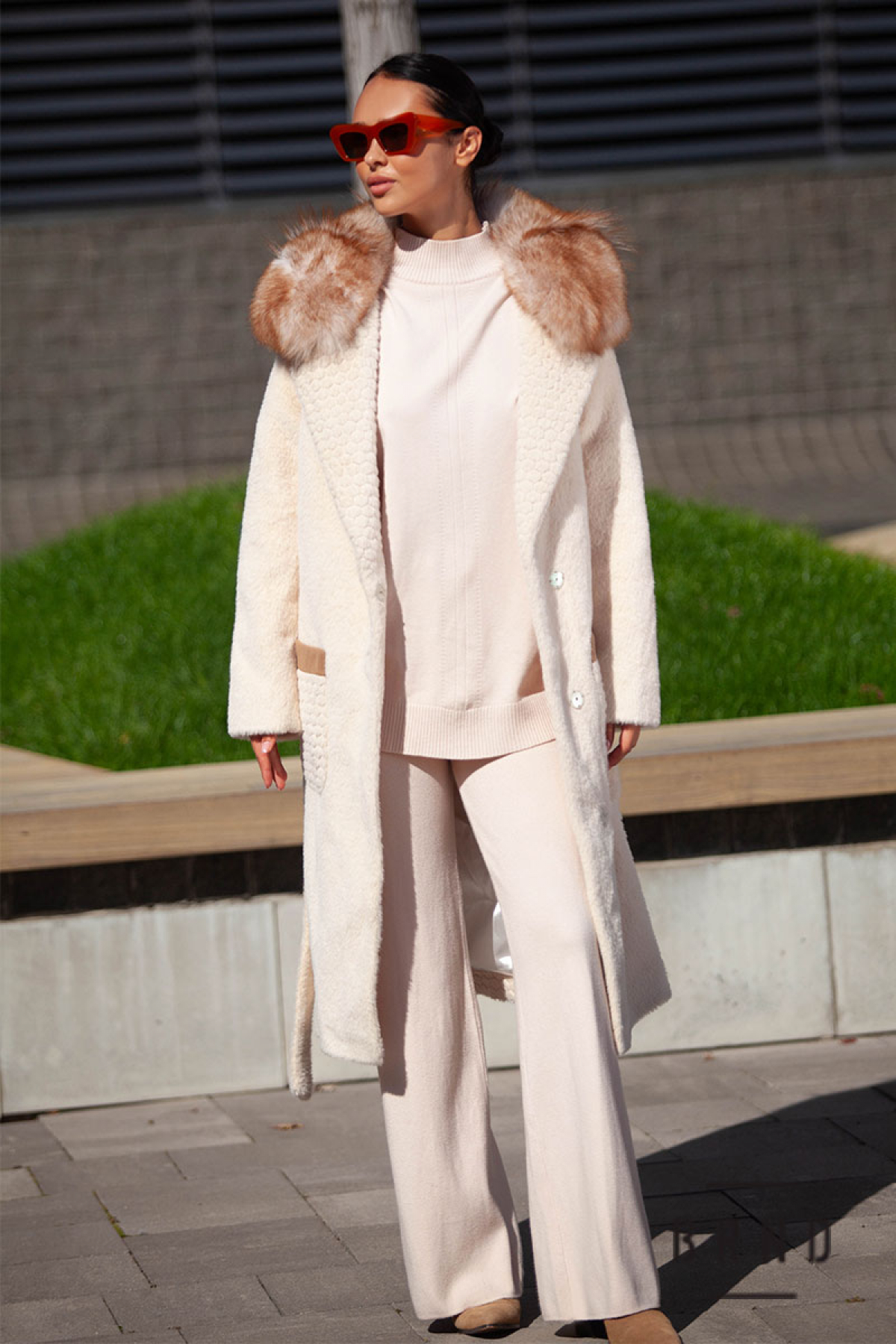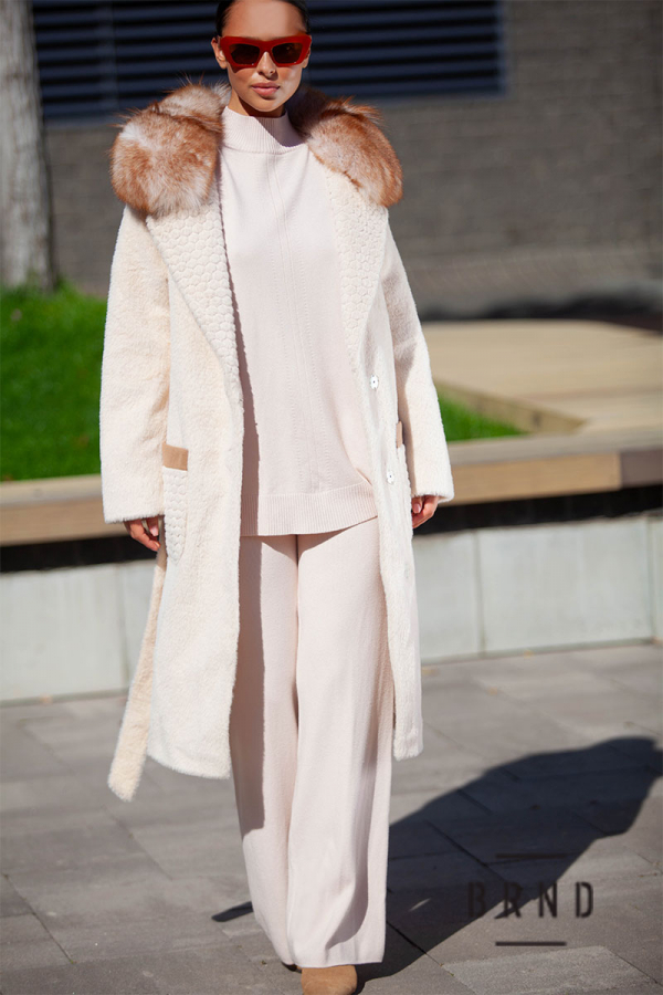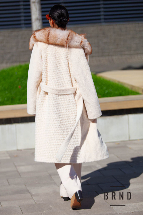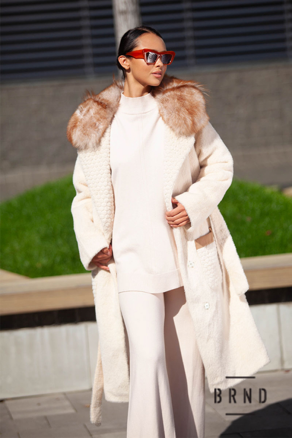 Шуба из эко меха, прямого кроя, с поясом, ворот-песец (Gucci)