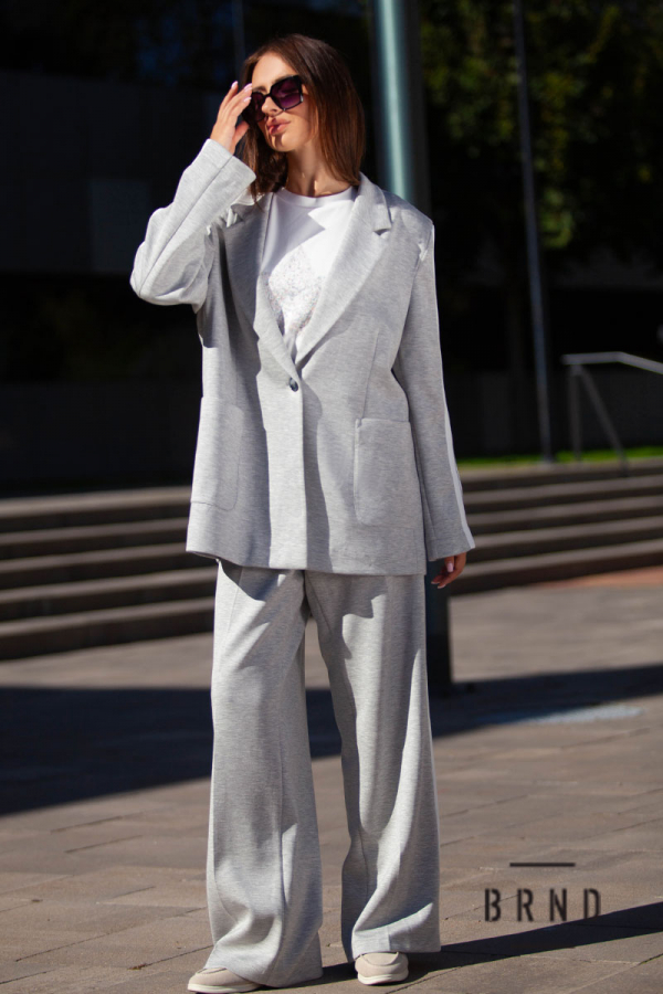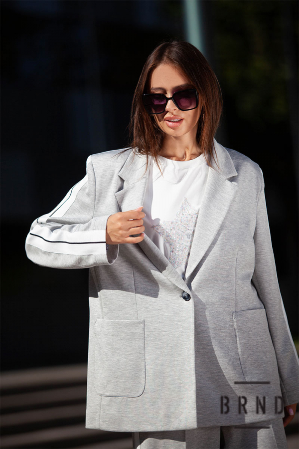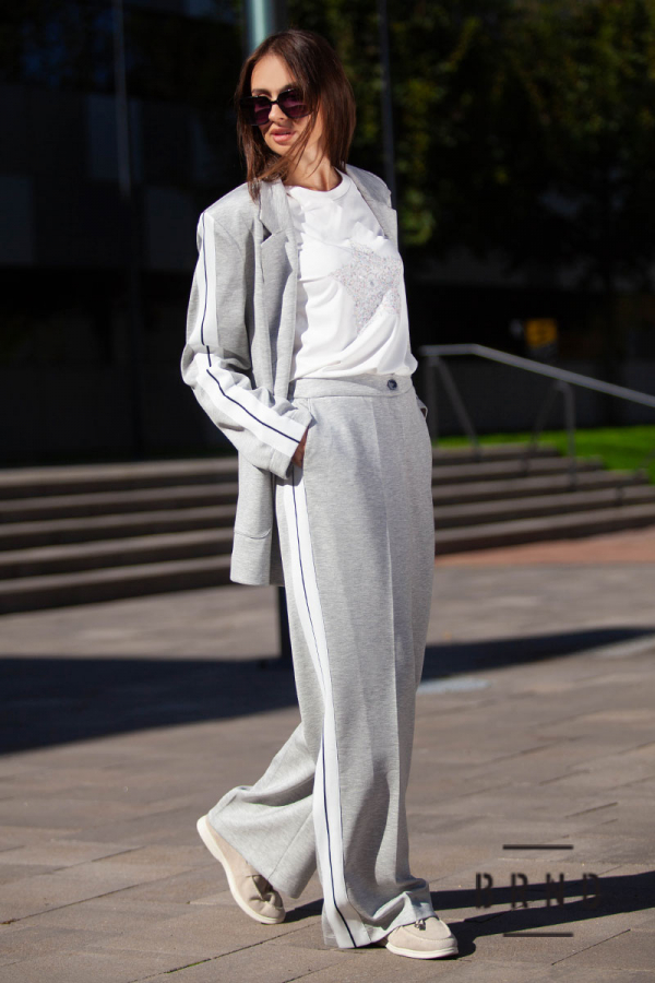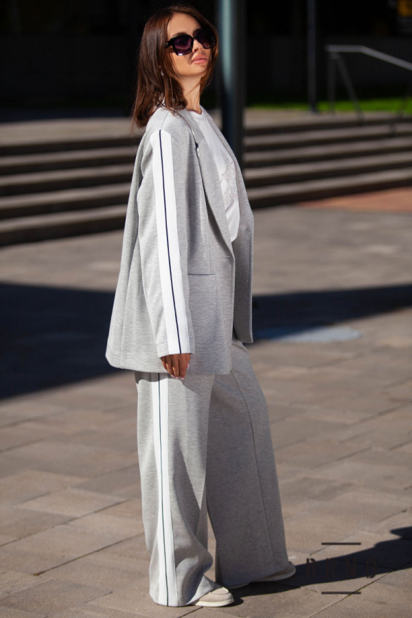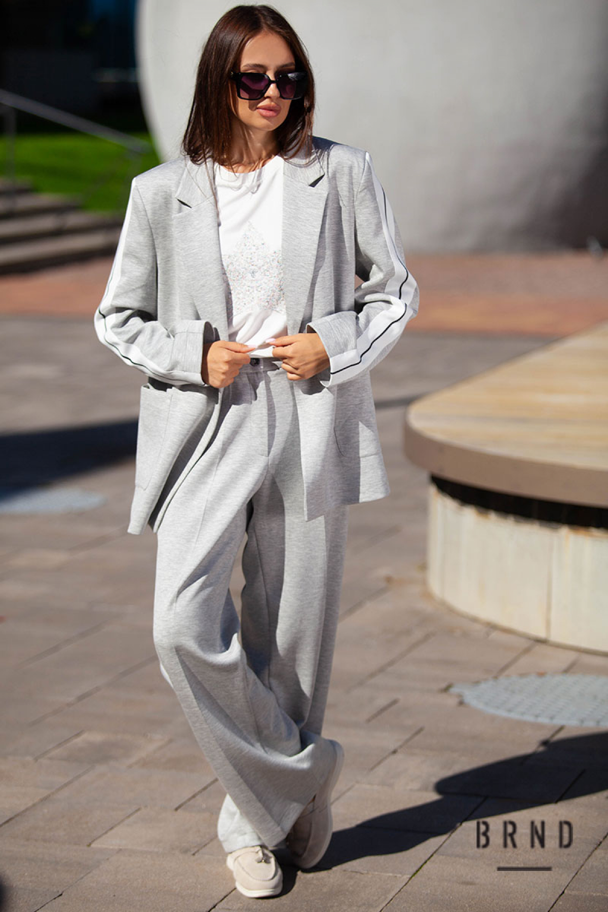Костюм трикотажный с лампасами: жакет прямого кроя с накладными карманами; брюки с косыми карманами, прямые, широкие, посадка высокая (Gucci)