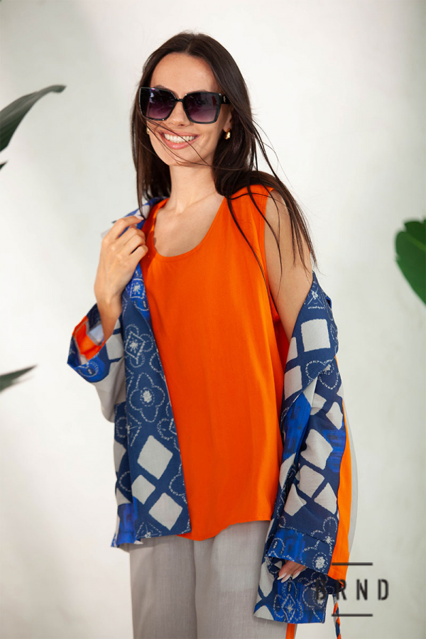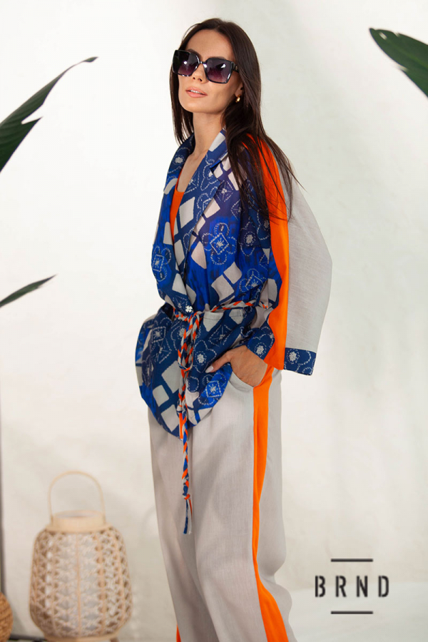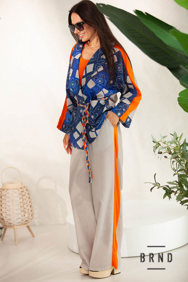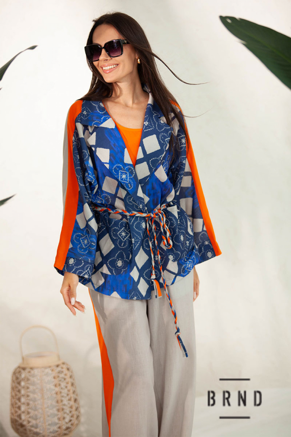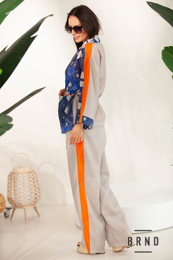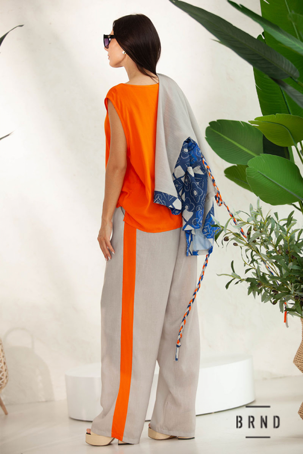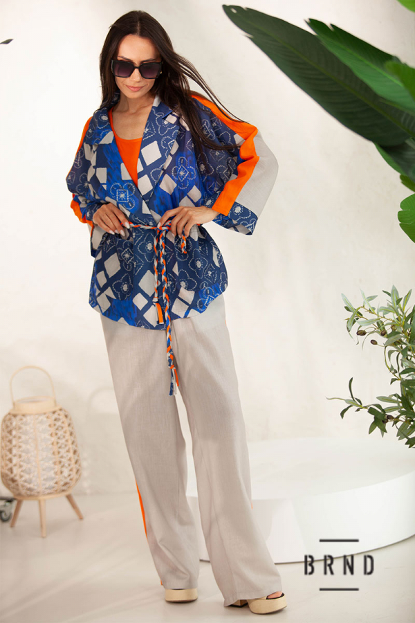 Костюм-тройка: жакет свободного кроя с поясом; майка прямого кроя; брюки прямые, широкие, посадка высокая, пояс-резинка (Kenzo)