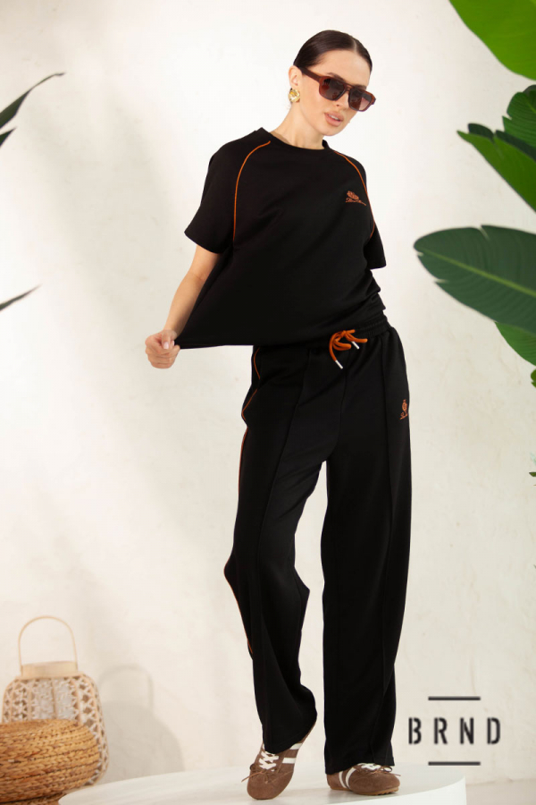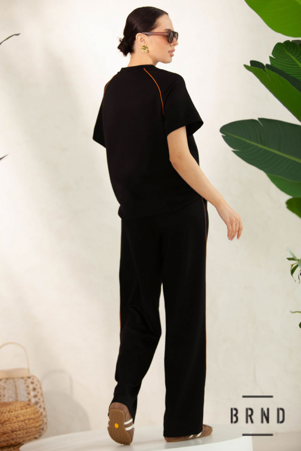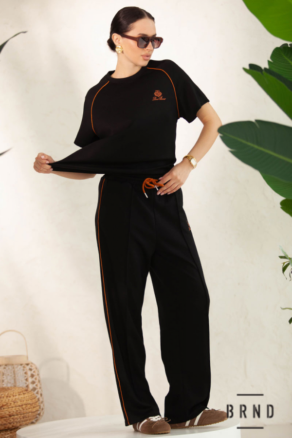 Костюм трикотажный с контрастной полосой: футболка свободного кроя; брюки с косыми карманами и стрелками, прямые, посадка средняя, пояс-резинка и шнур (Loro Piana)