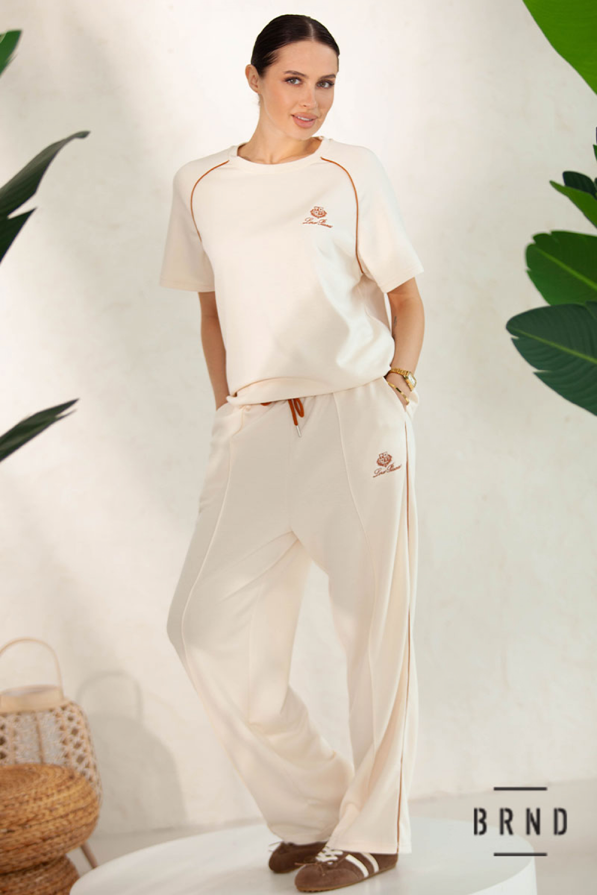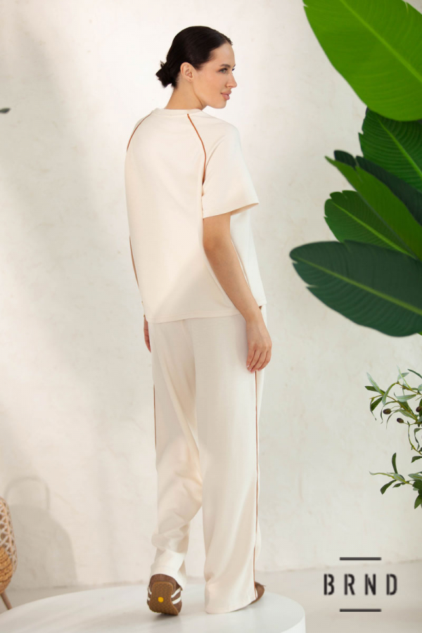 Костюм трикотажный с контрастной полосой: футболка свободного кроя; брюки с косыми карманами и стрелками, прямые, посадка средняя, пояс-резинка и шнур (Loro Piana)