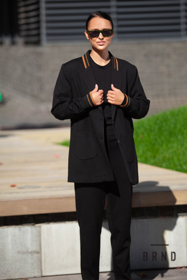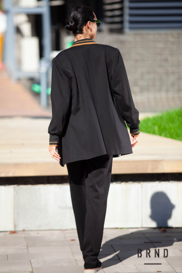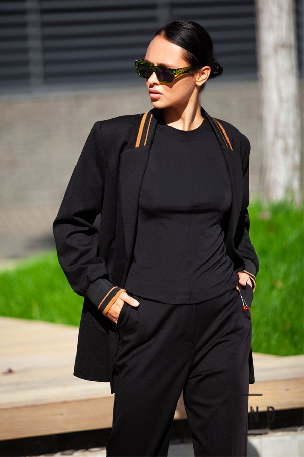 Костюм: жакет прямого кроя с трикотажными манжетами и воротом; брюки зауженные, посадка средняя (Miu Miu)