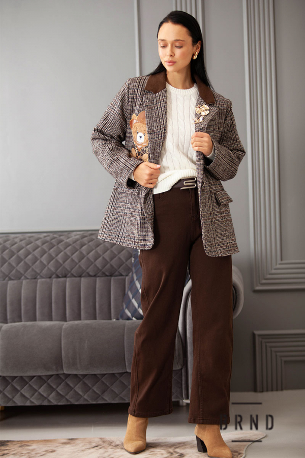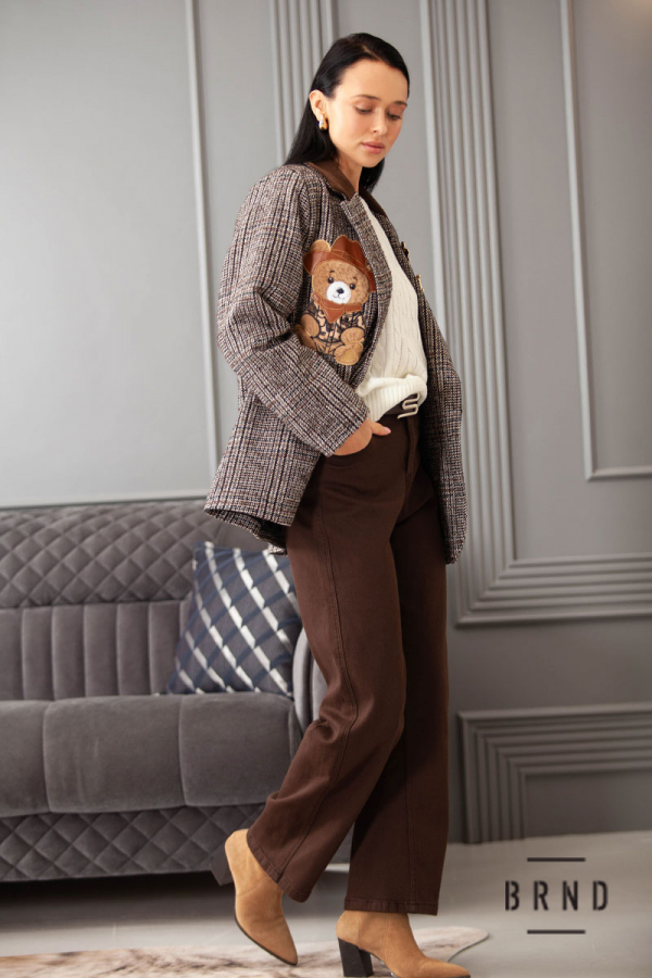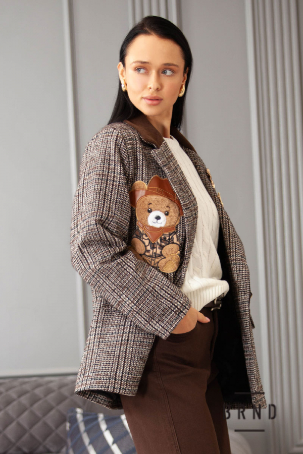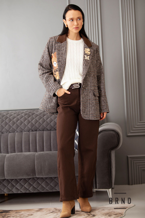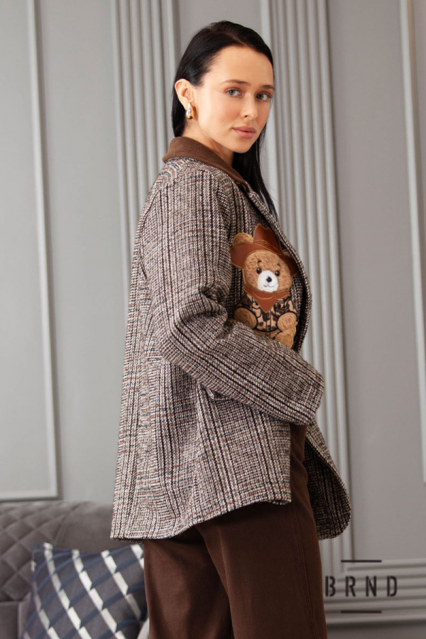 Пиджак прямого кроя с вельветовым воротом, декоративными нашивкой и булавками (Moschino)