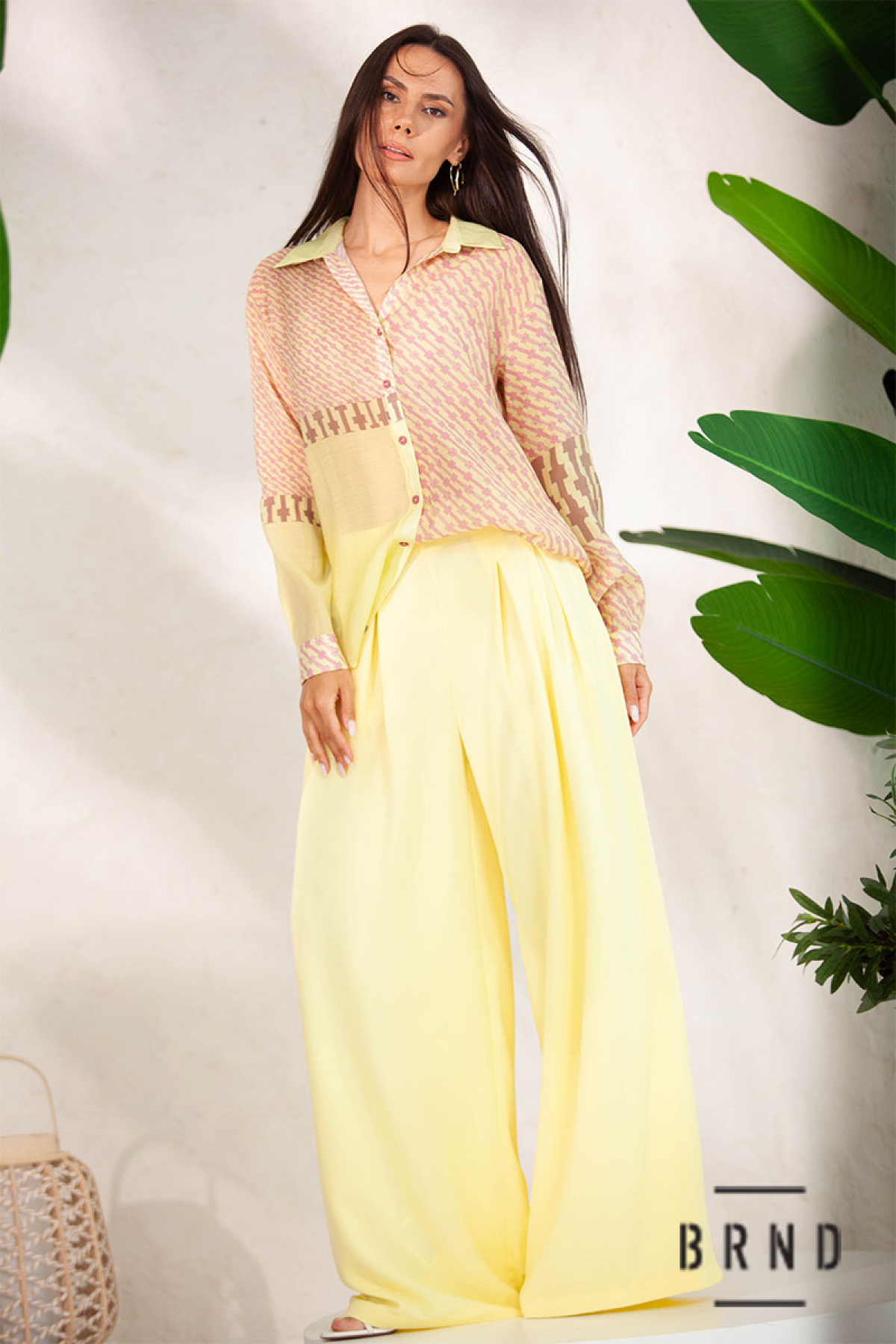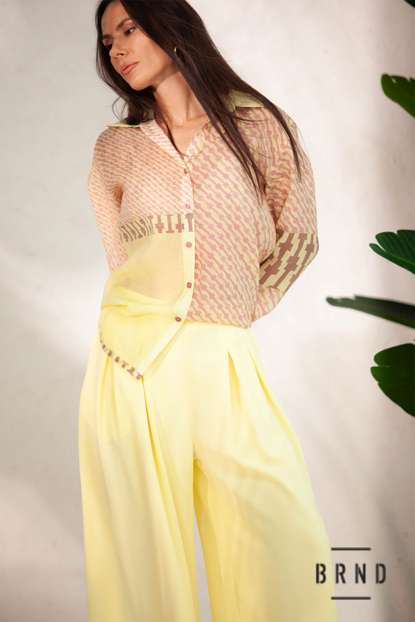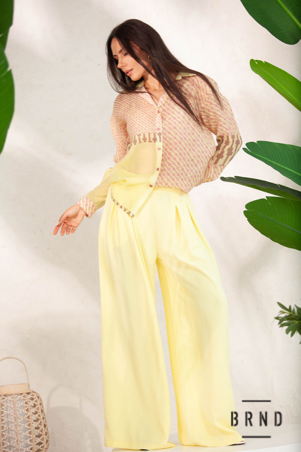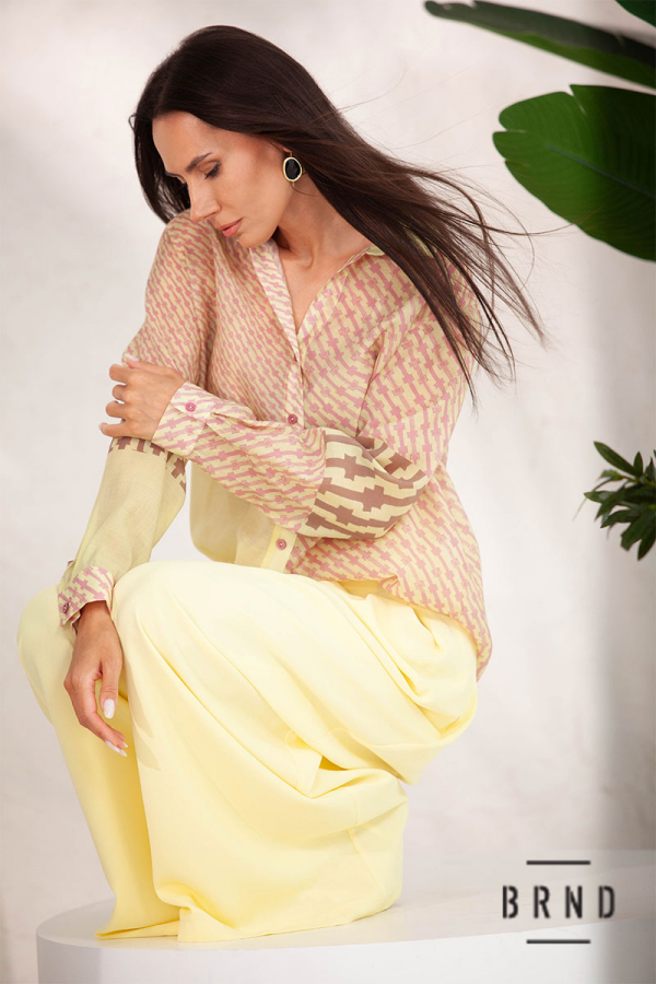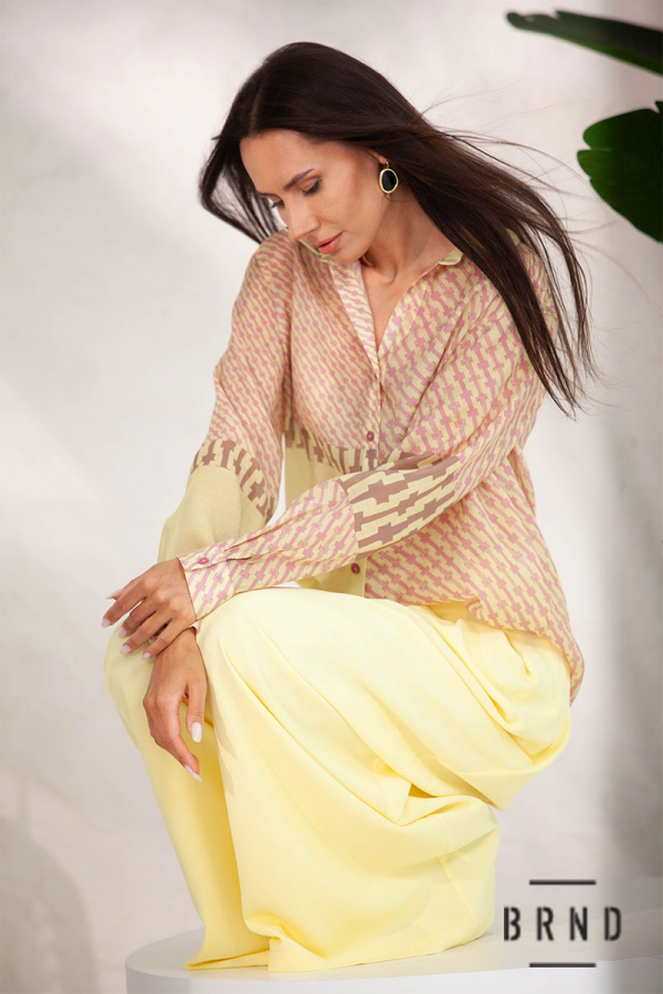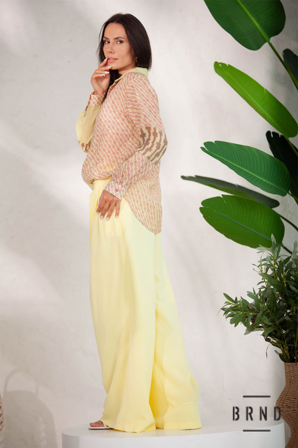 Костюм: рубашка с полупрозрачной ткани, крой прямой (Kenzo); брюки-палаццо с высокой посадкой (Max Mara)