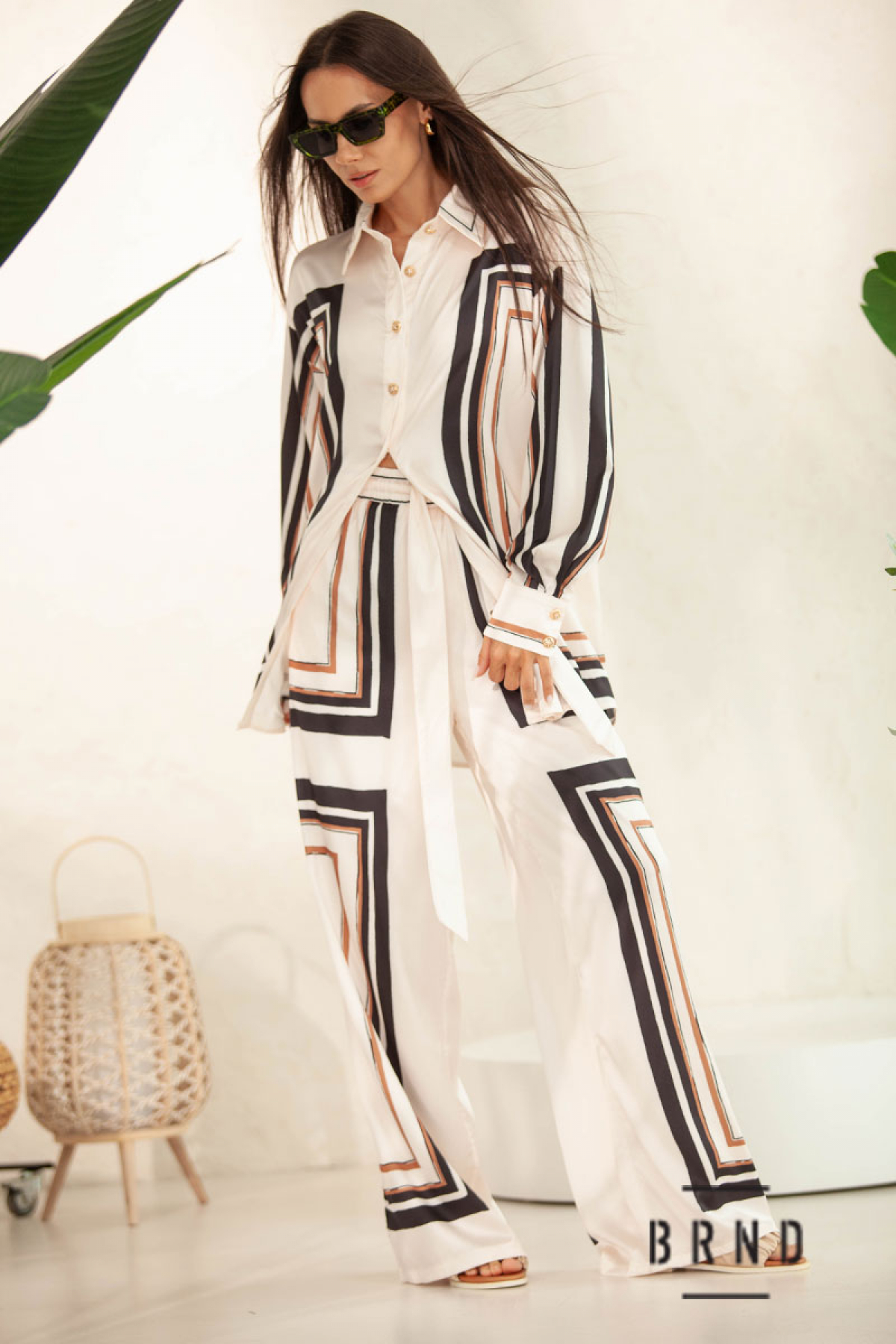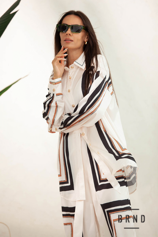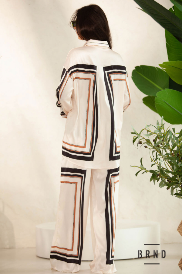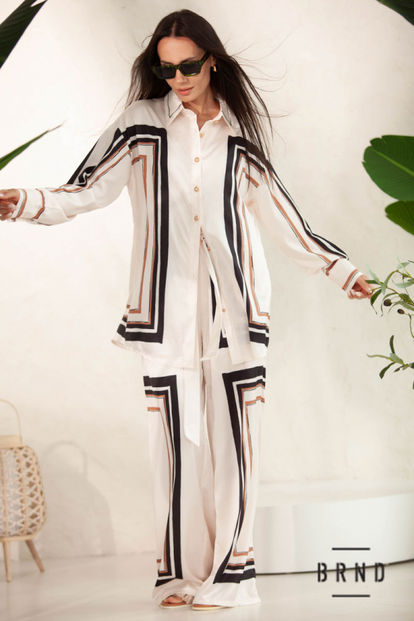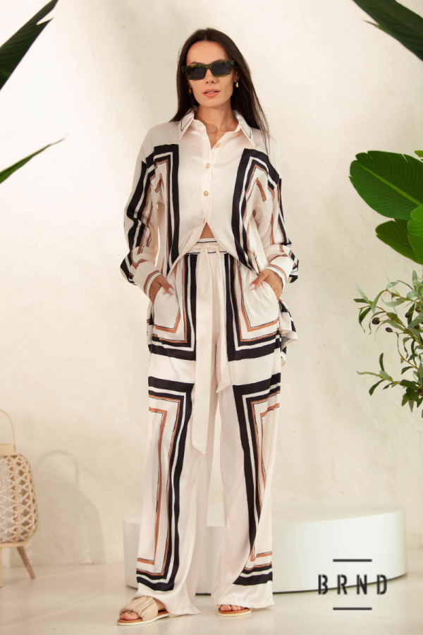 Костюм: рубашка прямого кроя, удлиненная; брюки с карманами, прямые, широкие, посадка высокая, пояс-резинка и лента (Zimmermann)