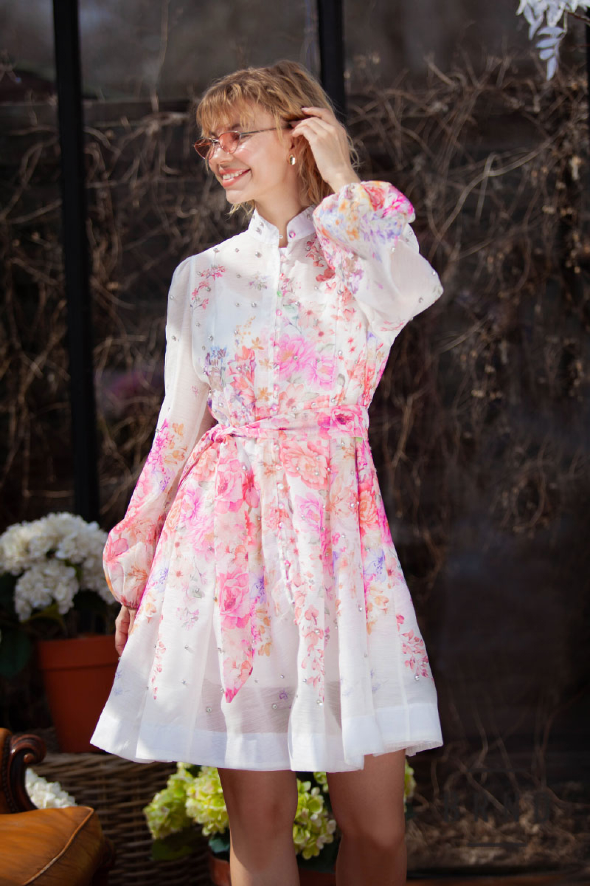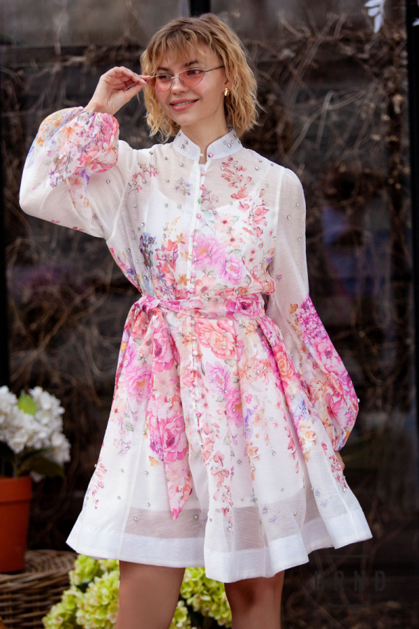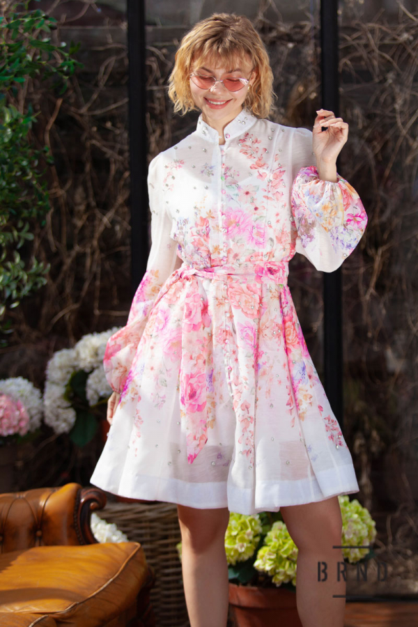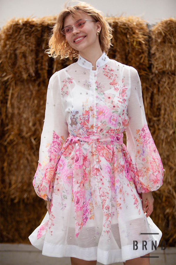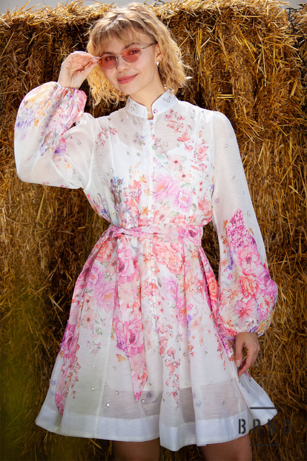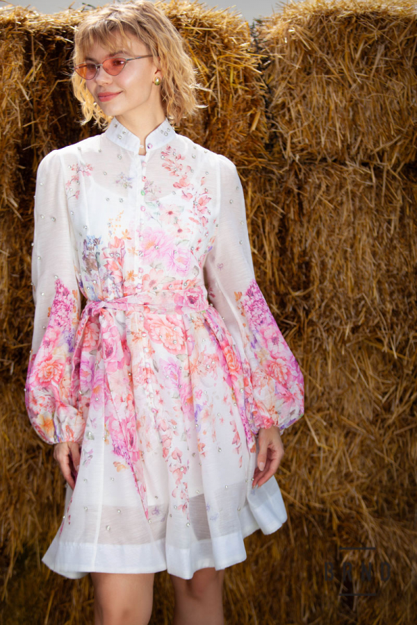 Платье с отрезной линией талии, поясом, комбинацией, карманами и потайной молнией по центру спинки, рукав-буф, ворот-стойка, декор-камни (Zimmermann)
