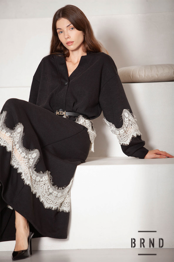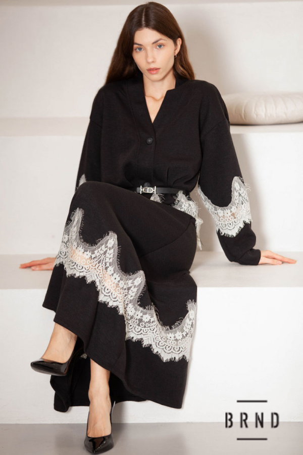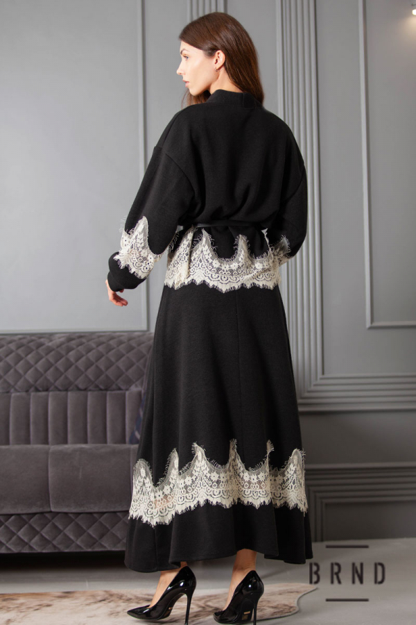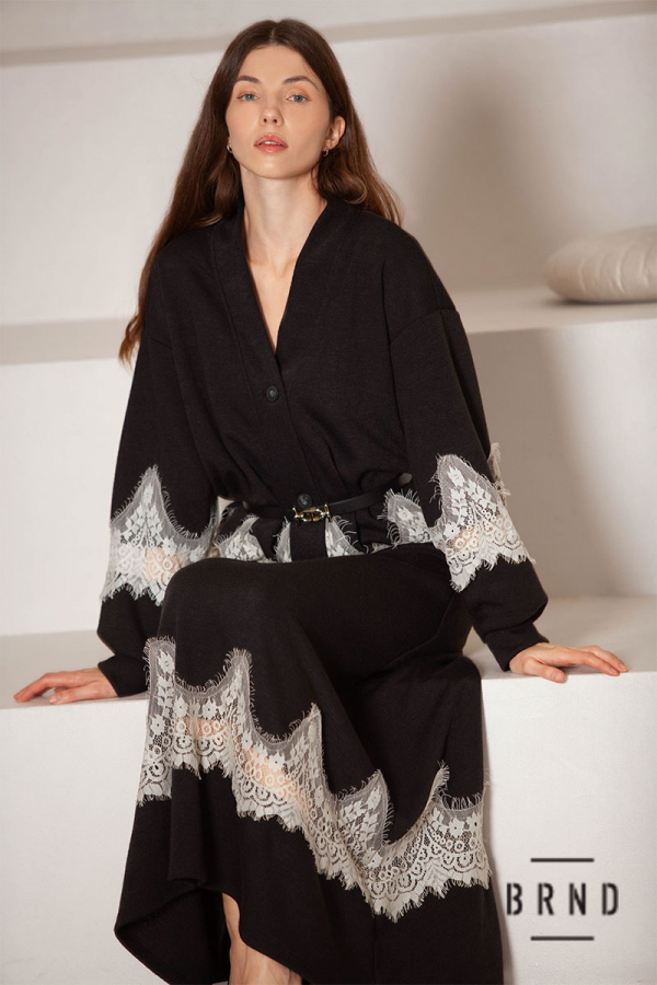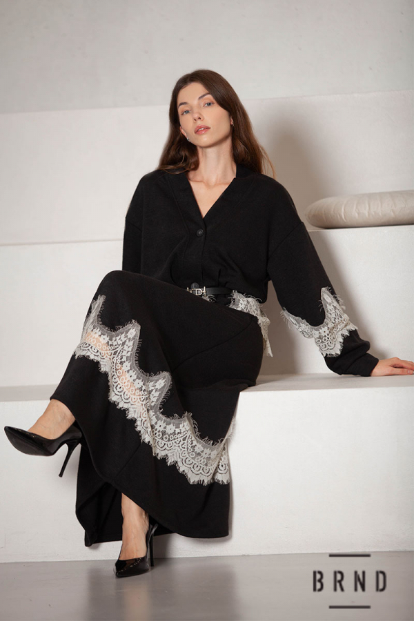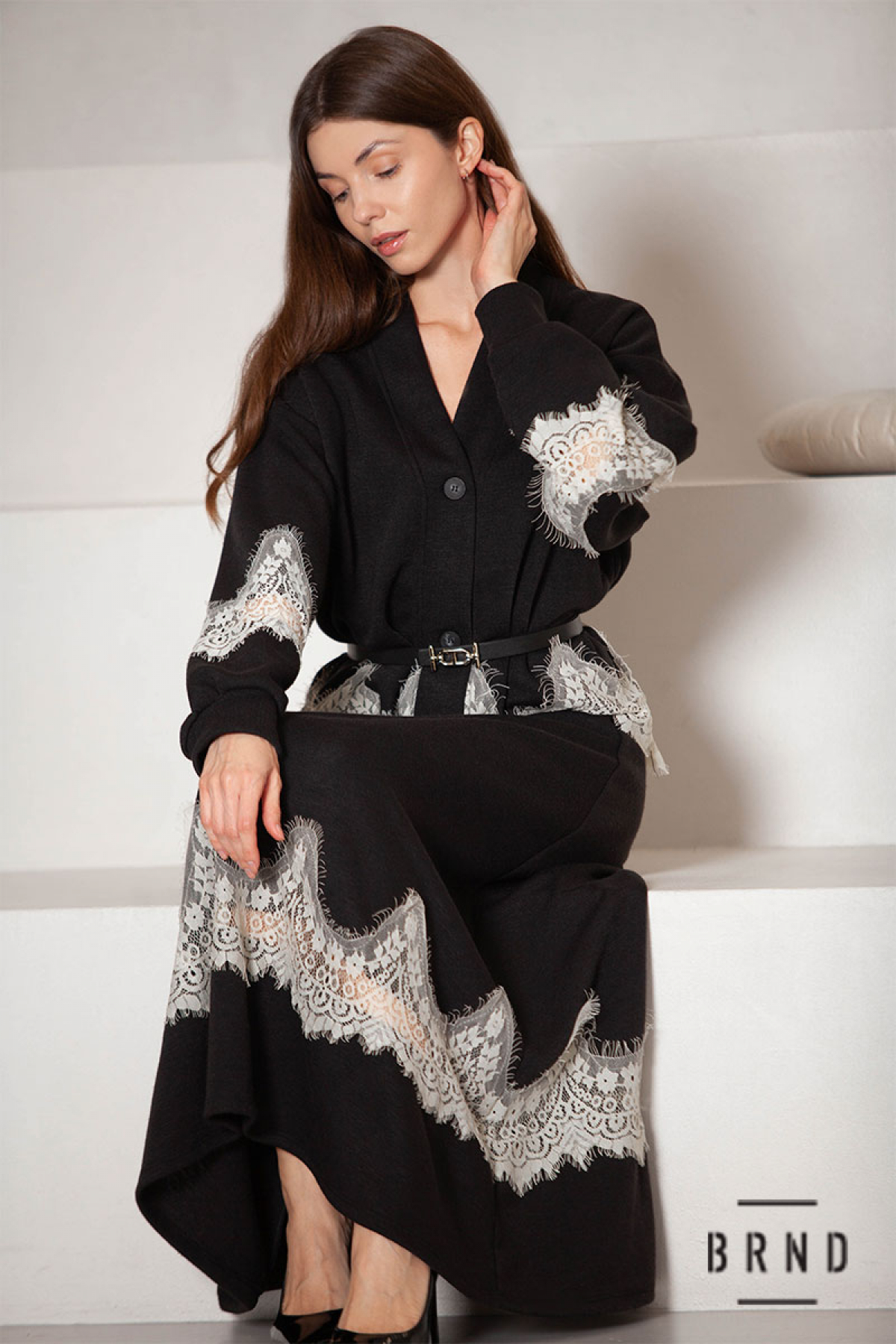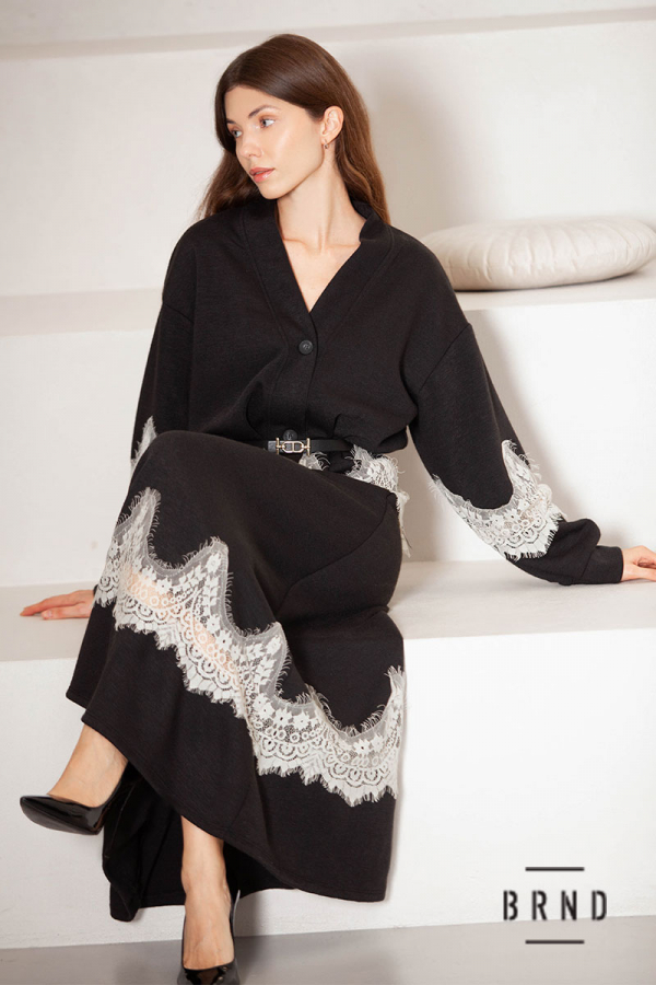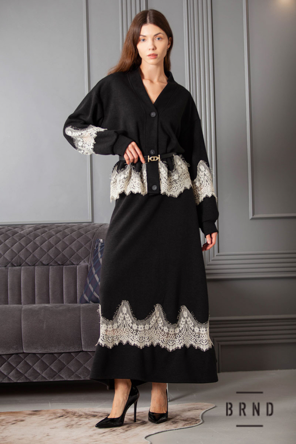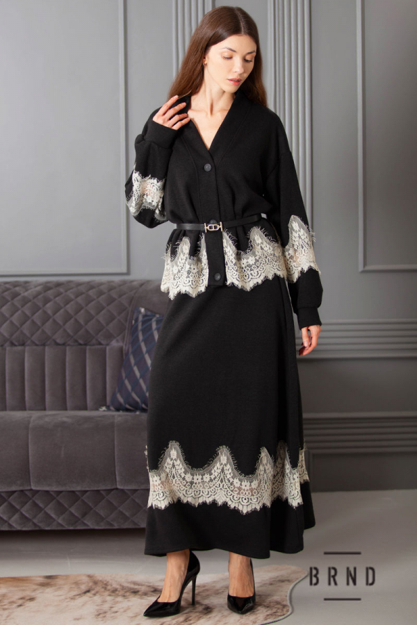 Костюм трикотажний: кардиган вільного крою, на ґудзиках, оздоблення-мереживо; спідниця трикотажна А-подібного крою, пасок-гумова стрічка, оздоблення-мереживо (Salvatore Ferragamo)