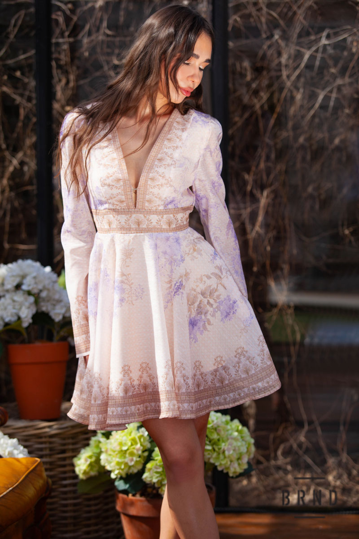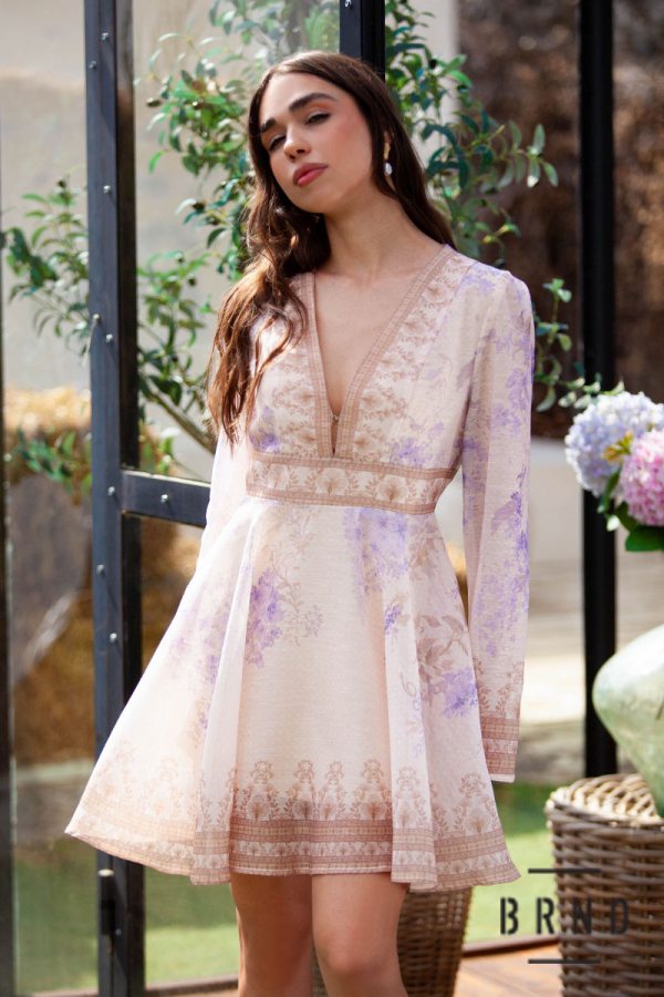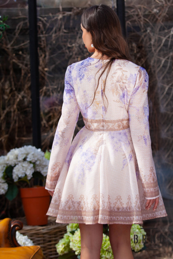 Сукня Dawning Plunge у кольорі Lilac Floral з глибоким V-подібним вирізом, кишенями, та фіксованим поясом, з довгими рукавами та пишною спідницею (Zimmermann)